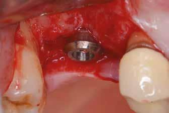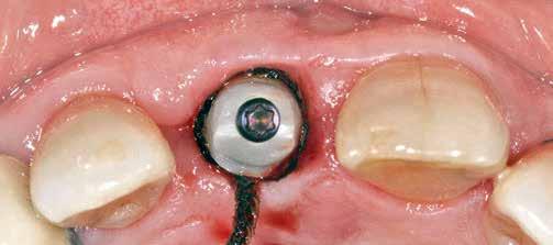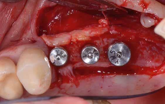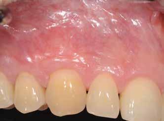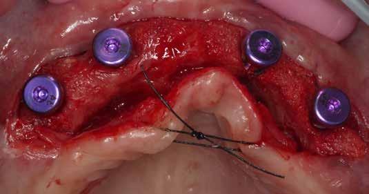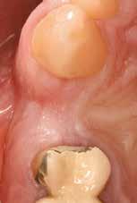 mokhoz képest. Az implantátum-felszabadítással egy időben a keratinizált íny és a vesztibulum helyreállítását is terveztük. Ezúttal félvastag lebenyt preparáltunk, ezt palatinális irányból kezdtük (9. ábra) , hogy felfedjük a zárócsavarokat, de a kötőszövetet meghagyjuk az implantátumok körül. A zárócsavarokat eltávolítottuk és a megfelelő magasságú gyógyulási csavarokat behelyeztük (10. ábra).