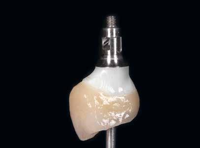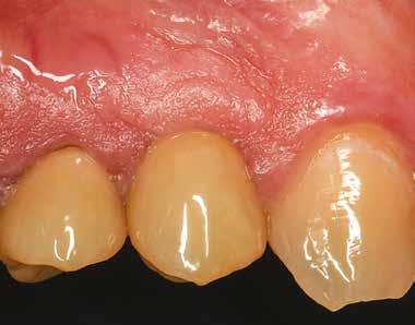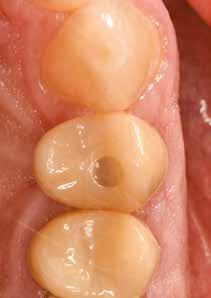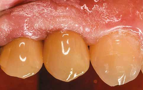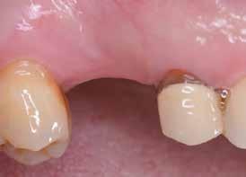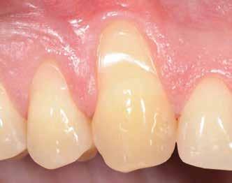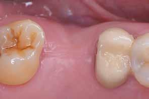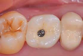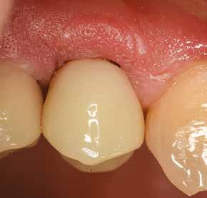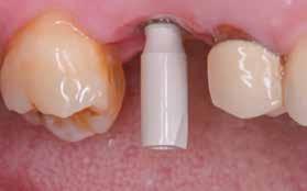 Az utánkövetési időpontokat a műtét utáni 30-adik és 60-adik napra terveztük. Két hónapos gyógyulási idő után egy monotípus scan bodyt csavartunk az implantátumba, és digitális lenyomatot vettünk Virtuo Vivo intraorális szkenner segítségével (Straumann) (21. és 22. ábra). A CAD feldolgozáshoz a coDiagnostiX szoftvert (Dental Wings) használtuk, majd egy fémmentes pótlást (cirkónia) cementeztünk (RelyX U200, 3M) az RT Variobase felépítményre (átmérő: 5 mm, magasság: 6 mm; Straumann) a csavarral rögzített pótlásnál. A felépítmény magassága ennek megfelelően lett beállítva (23. és 24. ábra). Az implantátum gyártójának ajánlásai szerint a pótlást 35 Ncm nyomatékkal húztuk meg (25. és 26. ábra). Végül a csavarnyílást kompozittal zártuk (27. ábra)