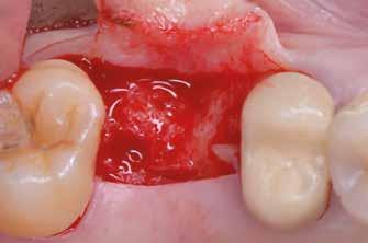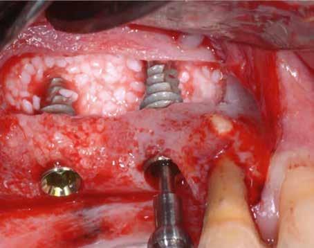 Teljes vastagságú lebenyt preparáltunk, hogy megnézzük a korábbi augmentációnk eredményét, mind a jobb (7. a. ábra) , mind a bal oldalon (7. b. ábra) . Nyolc darab implantátumot raktunk be és egy újabb réteg csontpótlót (GTO) helyeztünk fel bukkálisan mindkét oldalon. A kollagénes sticky bioanyag tulajdonságainak köszönhetően nem volt szükséges előtte hidratálni, mivel odatapadt, ahová helyeztük, ezáltal nem kockáztattuk, hogy egyes szemcséket elvesztünk az eljárás alatt (8. a–b. ábra) . A csontpótlót ezután mindkét oldalon membránnal (OsteoBiol Evolution) fedtük és zártuk a sebet.