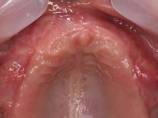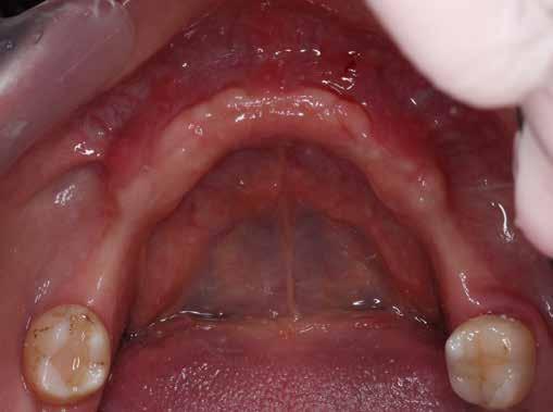 mok felszabadítása lágyrészkorrekcióval. A fogak eltávolítását követően a páciens egy teljes, lemezes fogpótlást kapott. A fogak eltávolítása után 4 hónapos rehabilitációs idő következett, hogy megfelelően gyógyulhasson a terület. Az ideiglenes fogsort kétszer béleltük alá ezen időszak alatt, hogy tökéletes illeszkedést biztosítsunk.