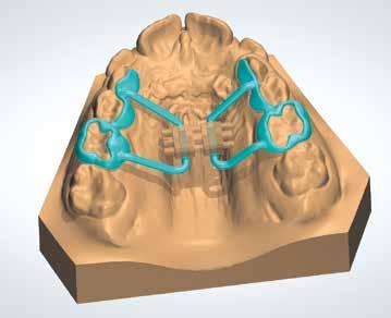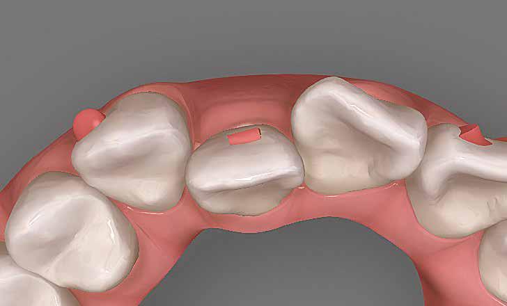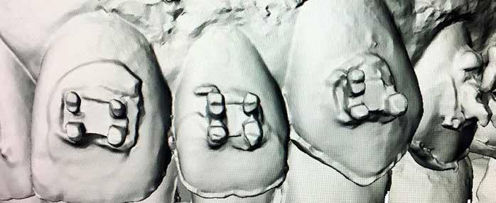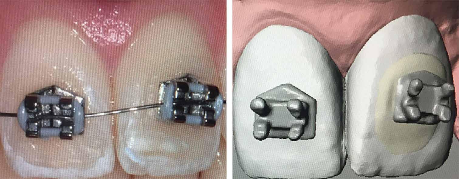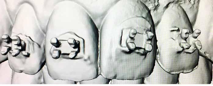 Az ideális bracket-pozíciók meghatározását követően a Maestro 3D software segítségével létrehoztuk azt a fájlt, melynek alapján egy 3D nyomtató segítségével létre tudtuk hozni a ragasztási sablon elkészítéséhez szükséges modellt. A bal oldali fogíven a bracketeket olyan módon integráltuk a modellbe, hogy később egy hagyományos, thermoplasztikus clear anyagból készült sablon kialakításához fel tudjuk használni. Ez a sablon magában hordozza azokat a bracketeket, amelyeket a későbbiekben rögzíteni akarunk a fogak felszínére. A jobb oldali fogív esetében a program segítségével megterveztünk egy Transfer Bite-ot, melynek a segítségével a továbbiakban lehetőségünk lesz a bracketek pontos pozicionálására. A Transfer Bite biokompatibilis anyagból készül,