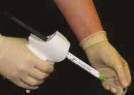 6. és 6. a ábra: A speciálisan hosszú távra gyártott rugalmas (puha) alábélelő szilikont finoman, magas nyomáson injektáljuk mindkét nyereg belső felére. Egy adagoló használata javasolt a 60-as keménység miatt és azért, hogy a munkát megkönnyítsük.