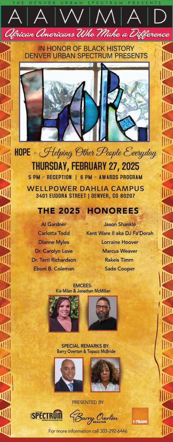 Denver Urban Spectrum is a monthly publication dedicated to spreading the news about people of color. Contents of Denver Urban Spectrum are copyright 2024 by Bizzy Bee Enterprise. No portion may be reproduced without written permission of the publisher.