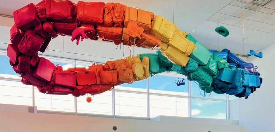Suspended near Gate B60, the 30-foot long, 20-foot wide installation weighs nearly three tons and features nearly 200 pieces in the majestic colors of Colorado’s sunsets. It symbolizes powerful messages of connection, community and the constant motion of life.