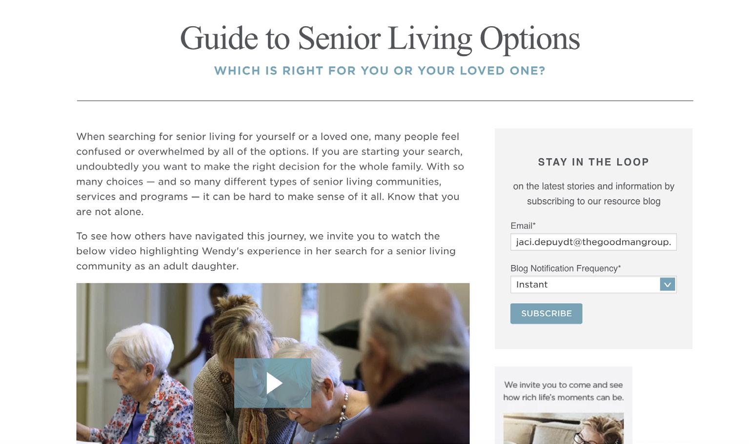 + LEAD GENERATION Hi there! JULY 7, 2020 NAME, your guide has arrived! We’re honored to be of assistance on your senior living journey and are here to answer any questions you might have. You can access the guide at any time by clicking the button below: You received this email because you are subscribed to Marketing Information from The Goodman Group Update your email preferences to choose the types of emails you receive. Unsubscribe from all future emails. We invite you to check out our blog for even more helpful tips and stories. Kind regards, The Goodman Group 1107 Hazeltine Boulevard, Suite 200, Chaska, MN 55318 952-361-8000 Guide to Senior Living Options DOWNLOAD External Emails 1) THANK YOU/DOWNLOAD EMAIL Hello! JULY 7, 2020 NAME, did you find the Guide to Senior Living Options helpful? You received this email because you are subscribed to Marketing Information from The Goodman Group Update your email preferences to choose the types of emails you receive. Unsubscribe from all future emails. If you have any questions, just send us an email and we’ll be happy to help! Kind regards, The Goodman Group 1107 Hazeltine Boulevard, Suite 200, Chaska, MN 55318 952-361-8000 Finding the right senior living community is no easy task. From personalized services and amenities to social connections, every community has its benefits. That’s why we sat down with one of our residents, Jim, to talk about how he came to choose one of our communities. He shares “I can age here, comfortably and happily. And you can’t get me to get out of here. I’m staying. I’m happy here.” We invite you to watch the video below to learn more. 2) NURTURE EMAIL CTA TO VIDEO Touring soon? JULY 7, 2020 NAME, here’s another resource! You received this email because you are subscribed to Marketing Information from The Goodman Group Update your email preferences to choose the types of emails you receive. Unsubscribe from all future emails. Not sure where to tour? We manage senior living communities nationwide. You can schedule your personal tour today! Kind regards, The Goodman Group 1107 Hazeltine Boulevard, Suite 200, Chaska, MN 55318 952-361-8000 To help you make the most of touring a senior living community, we invite you to take advantage out our free Guide to Senior Living Tours! This guide provides a list of important questions and items to consider before, during and after each tour. Click the button below to download the guide and prepare for your next tour! Guide to Senior Living Tours DOWNLOAD 3) NURTURE EMAIL CTA TO CHECKLIST 1. THANK YOU/DOWNLOAD 2. NURTURE VIDEO CTA 3. NURTURE CHECKLIST CTA Internal Email LEAD EMAIL An active lead! JULY 7, 2020 NAME downloaded a resource! A new contact downloaded the Guide to Senior Living Options resource on CONTACT.RECENT_CONVERSION_DATE and said they were interested in touring your community. Here’s their information: Name: CONTACT Email: CONTACT Phone: CONTACT Anticipated timeline of move-in: CONTACT Message: CONTACT Kind regards, The Goodman Group You received this email because you are subscribed to Marketing Information from The Goodman Group. Update your email preferences to choose the types of emails you receive. Unsubscribe from all future emails. 1107 Hazeltine Boulevard, Suite 200, Chaska, Minnesota 55318 952-361-8000 Hi there! JULY 7, 2020 NAME, your guide has arrived! We’re honored to be of assistance on your senior living journey and are here to answer any questions you might have. You can access the guide at any time by clicking the button below: You received this email because you are subscribed to Marketing Information from The Goodman Group Update your email preferences to choose the types of emails you receive. Unsubscribe from all future emails. We invite you to check out our blog for even more helpful tips and stories. Kind regards, The Goodman Group 1107 Hazeltine Boulevard, Suite 200, Chaska, MN 55318 952-361-8000 Guide to Senior Living Options DOWNLOAD External Emails 1) THANK YOU/DOWNLOAD EMAIL Hello! JULY 7, 2020 NAME, did you find the Guide to Senior Living Options helpful? You received this email because you are subscribed to Marketing Information from The Goodman Group Update your email preferences to choose the types of emails you receive. Unsubscribe from all future emails. If you have any questions, just send us an email and we’ll be happy to help! Kind regards, The Goodman Group 1107 Hazeltine Boulevard, Suite 200, Chaska, MN 55318 952-361-8000 Finding the right senior living community is no easy task. From personalized services and amenities to social connections, every community has its benefits. That’s why we sat down with one of our residents, Jim, to talk about how he came to choose one of our communities. He shares “I can age here, comfortably and happily. And you can’t get me to get out of here. I’m staying. I’m happy here.” We invite you to watch the video below to learn more. 2) NURTURE EMAIL CTA TO VIDEO Touring soon? JULY 7, 2020 NAME, here’s another resource! You received this email because you are subscribed to Marketing Information from The Goodman Group Update your email preferences to choose the types of emails you receive. Unsubscribe from all future emails. Not sure where to tour? We manage senior living communities nationwide. You can schedule your personal tour today! Kind regards, The Goodman Group 1107 Hazeltine Boulevard, Suite 200, Chaska, MN 55318 952-361-8000 To help you make the most of touring a senior living community, we invite you to take advantage out our free Guide to Senior Living Tours! This guide provides a list of important questions and items to consider before, during and after each tour. Click the button below to download the guide and prepare for your next tour! Guide to Senior Living Tours DOWNLOAD 3) NURTURE EMAIL CTA TO CHECKLIST Hi there! JULY 7, 2020 NAME, your guide has arrived! We’re honored to be of assistance on your senior living journey and are here to ans