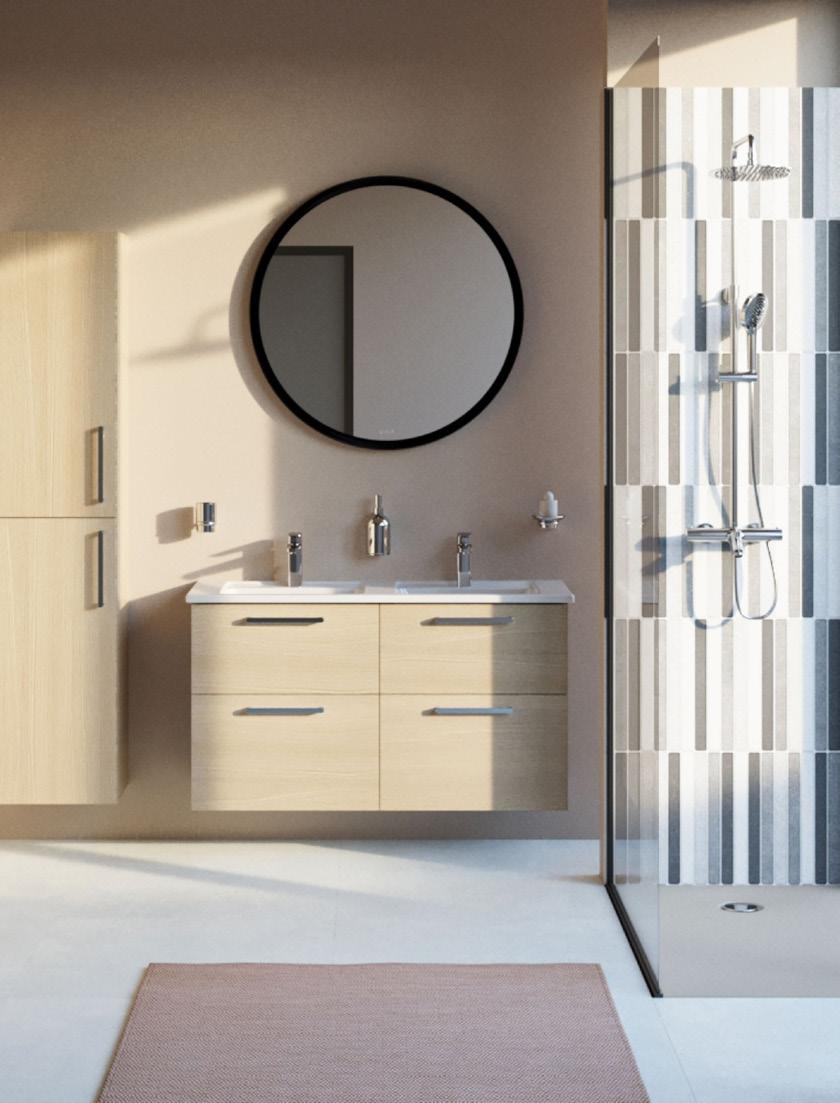 The new Root collection offers a wide range of product sizes and styles in mix-andmatch colour and wood unit combinations with complementing handle styles, along with Root brassware and the choice of three washbasins to suit.