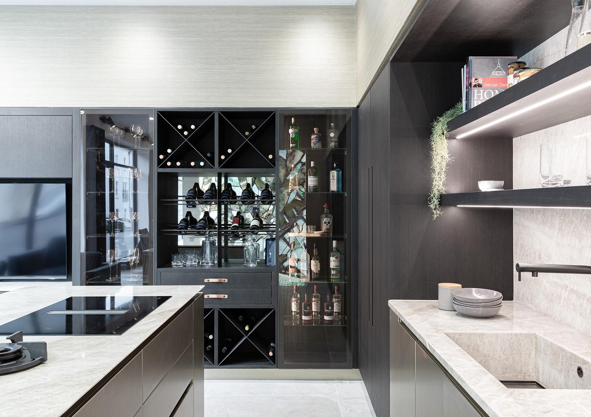 For the games room and bar area, the client took inspiration from a previous Poggenpohl project, requesting a darker colour scheme to the kitchen furniture as well as undercounter cooling appliances.