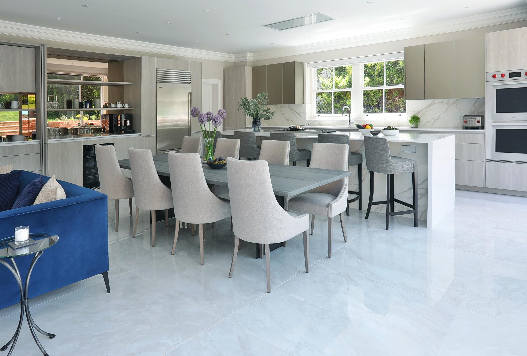 This kitchen also included +Stage pocket doors to hide the breakfast area during gatherings (shown open here) as well as the use of book-matching to the Neolith ceramic splashbacks which combined with bronze mirror glass for a beautiful and elevated finish to the design.