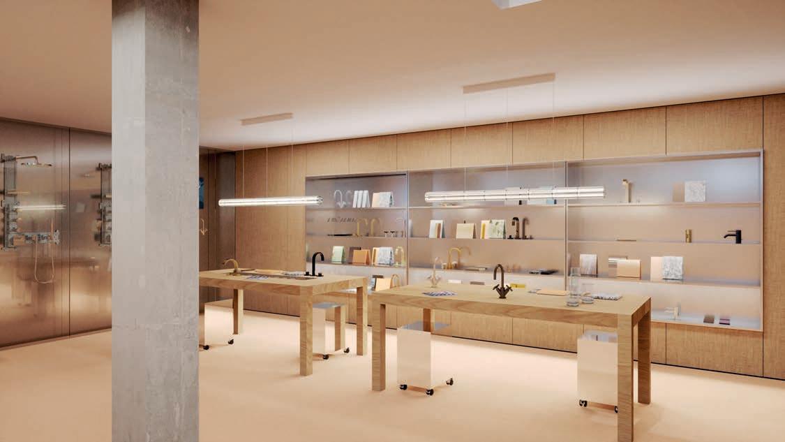 The lower showroom area is devoted to the speci cation of the company’s services. Its x-tra service and concealed solutions are clearly illustrated here, as is Dornbracht ReCra ed. The exible and modular design of the entire area allows it to be used both as a presentation and event space.