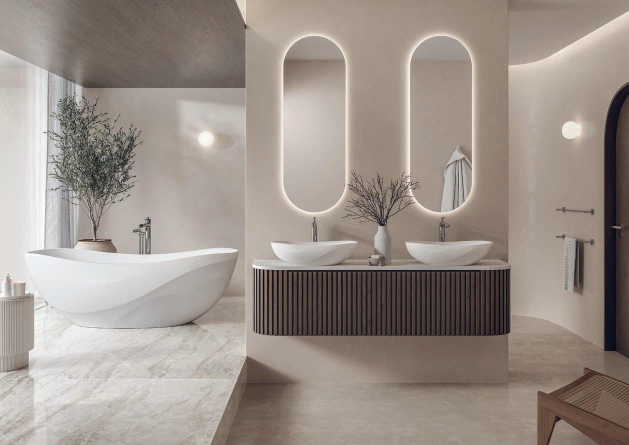 “This presence, this calmness, lends itself beautifully to the design of a bathroom collection. I live by the sea, and took photos of how the sea rests against the sand; how the wind a ects and sculpts the sand. It leaves these beautiful, calm, owing indents. The feeling of the movement and the natural marks that are le , are what I tried to capture.”