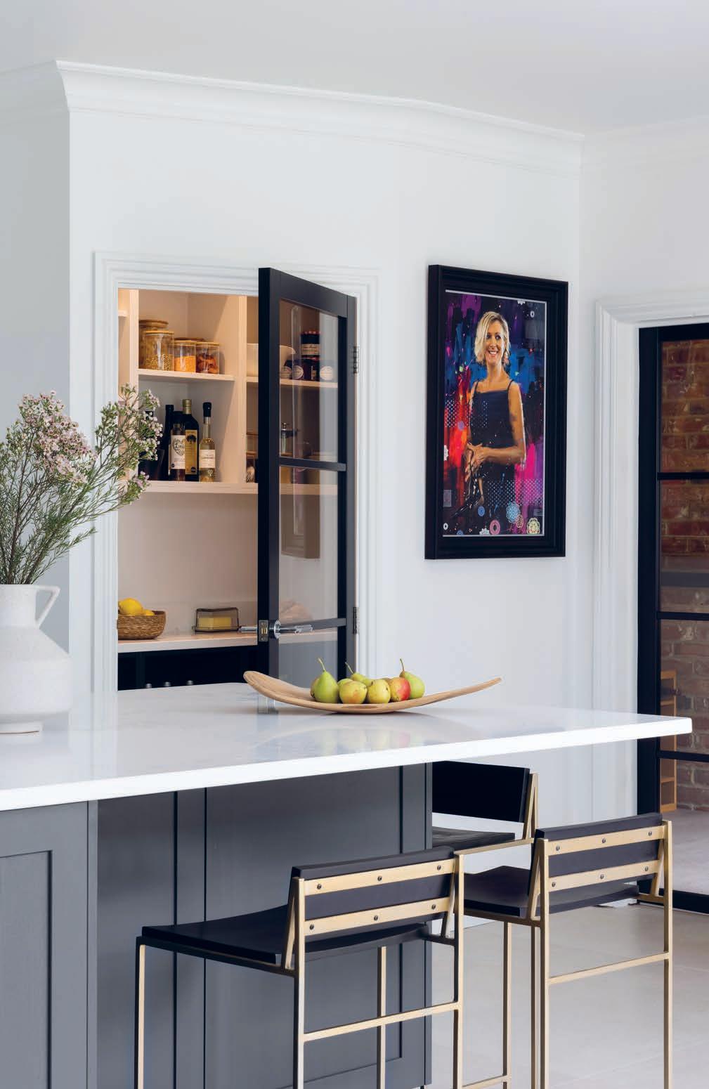 Earthy neutral colours help to create a canvas for a versatile space, along with splashes of green plants and personal touches like Susan’s striking portrait painting –a gift from Clive – and the glass door pantry, all adding personality and character to the contemporary space.