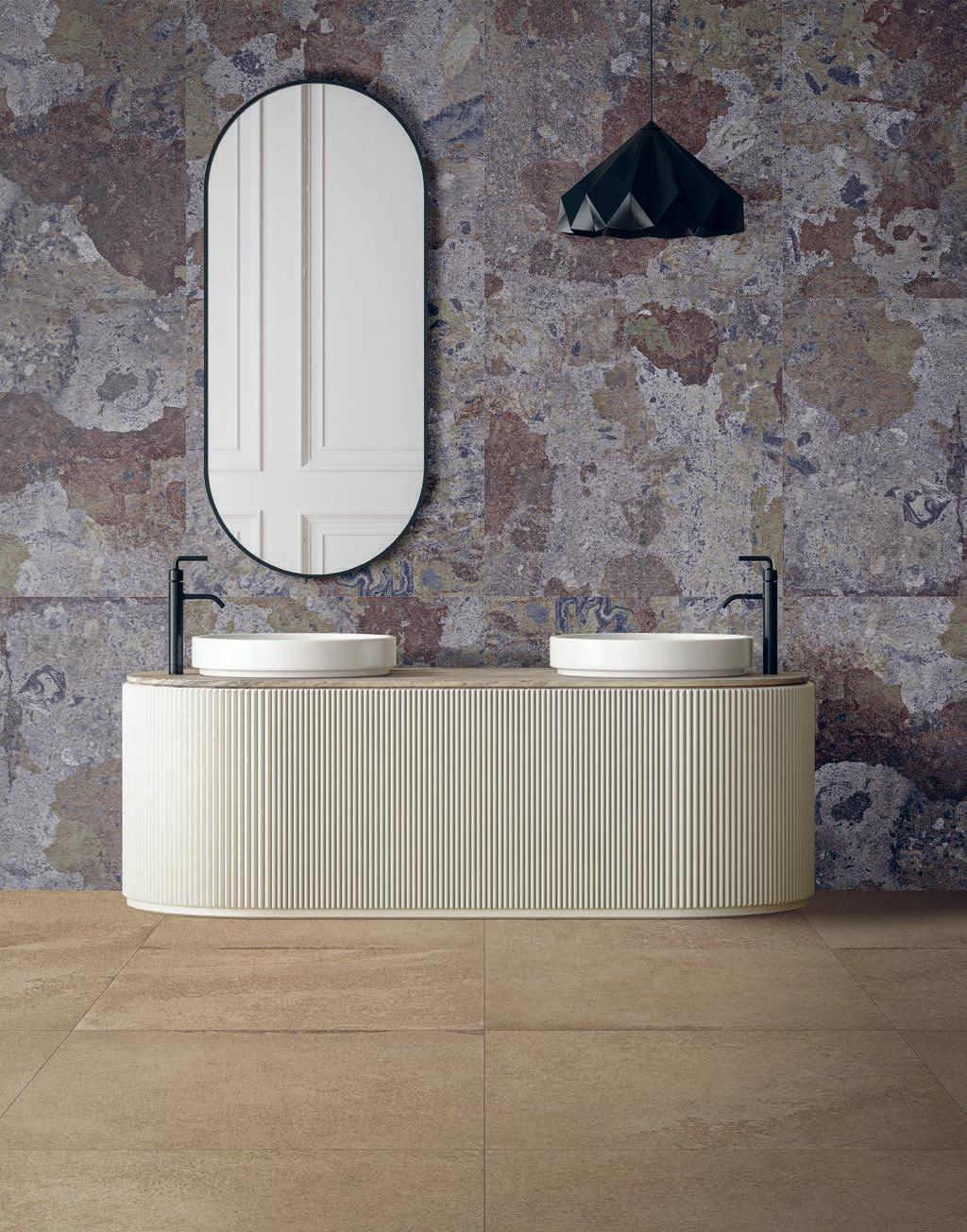 EARTHENWARE COLOURS: “Rich and warm, this year’s colour pale e focuses on introducing the earthy colours of the natural world, both indoors and outdoors. From olive and moss greens to terraco a and clay, Spanish manufacturers have created a diverse selection of tile sizes, nishes and colours; from on-trend terrazzo to threedimensional brick tiles and distressed large format oor tiles. The result is an inviting space that will stand the test of time.”