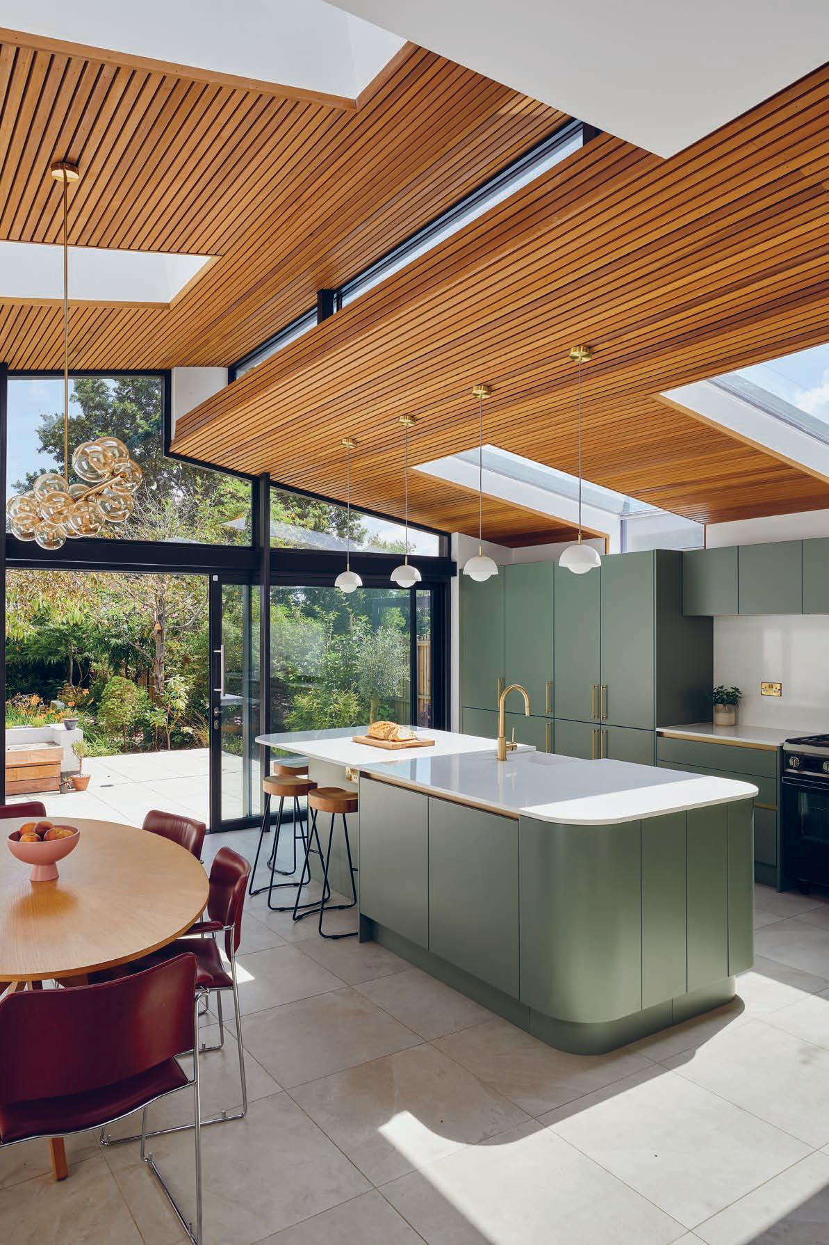 I answered the client’s kitchen brief by creating a scheme that includes earthy, natural wood materials with dominant Eucalyptus green lacquered hester cabinetry from A s Belgra ia ollection to complement their new extension space and help to create a seamless flow between the new kitchen and the garden.