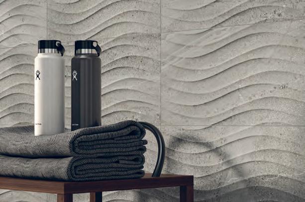 Right Natural stones with colour and texture are the elements that characterise the new offerings by Ceramiche Piemme at Cersaie. This included the Journey collection in which printing technology is used to create ripples, reliefs and 3D effects. The wall tiles are available in natural, silk, or antislip. Ceramiche Piemme / ceramichepiemme.it