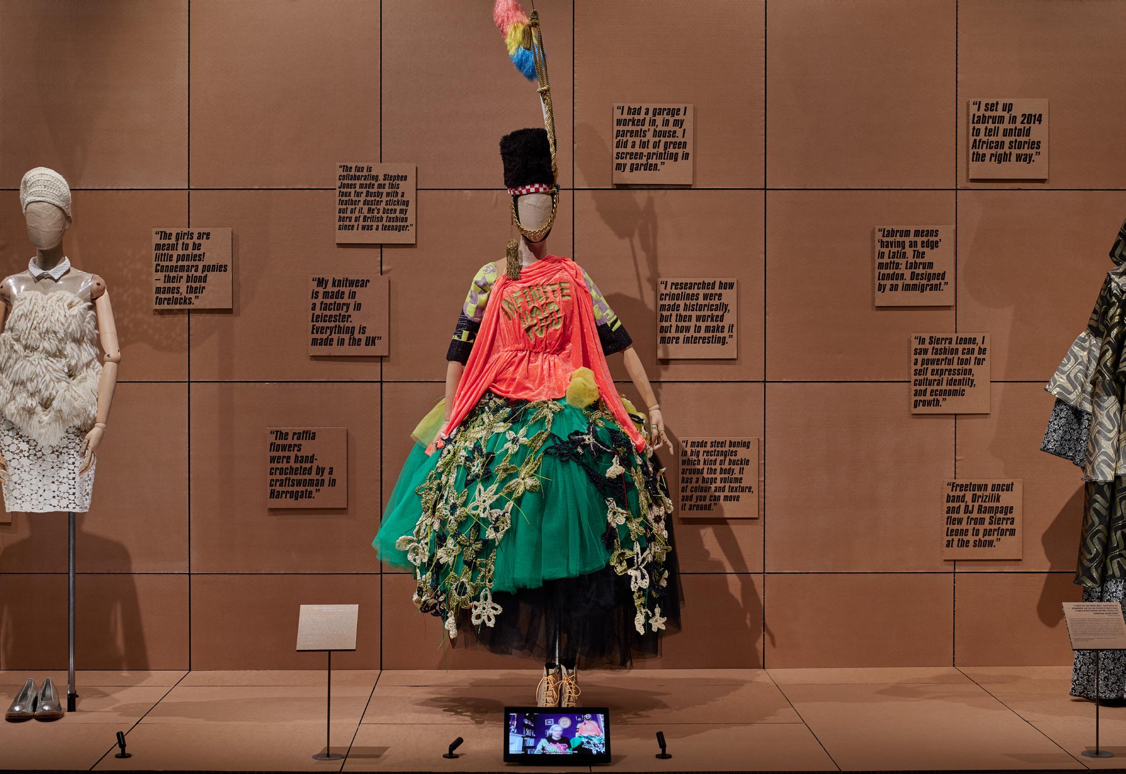 This spectrum of technical and hand-crafted innovation has flowed out of small London studios. Among the prints, the biographies of their creators can be found: everywhere you look in this exhibition, it is the multiplicity of designers’ identities that defines the creative power of London. Each designer has been invited to create a backdrop for their look, using digital files, deadstock or objects from their original collection.