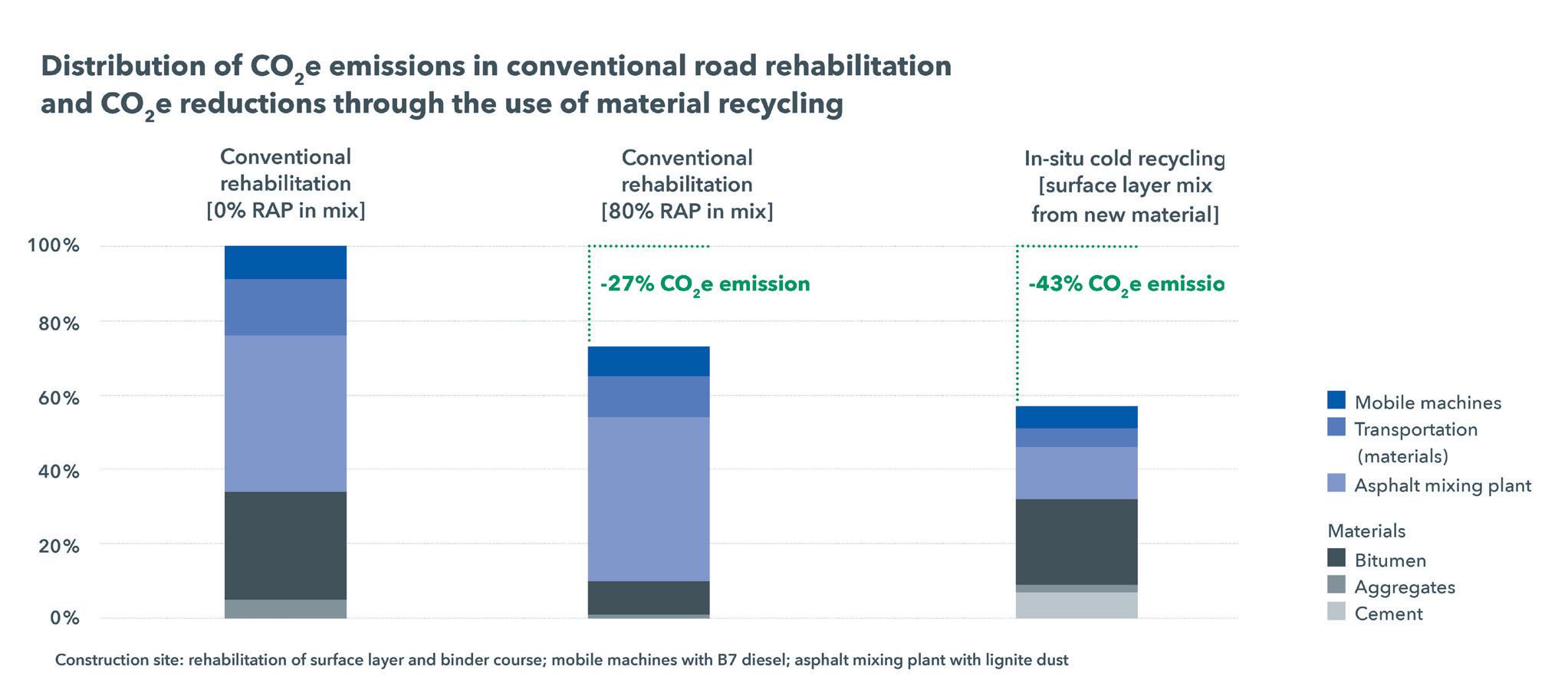 The column on the left shows the emissions arising from a conventional approach. Existing material is milled off and removed from the site before a new surface is paved with an asphalt mix produced from fresh material. Calculations of emissions show that the major proportion arises in the production of the asphalt mix and the materials this process requires.