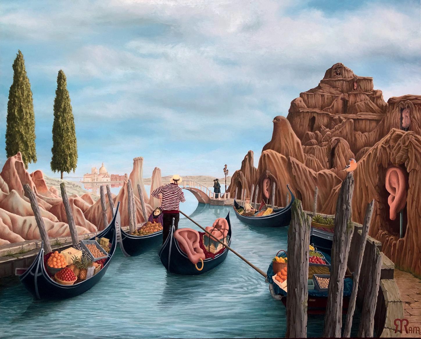 “In his bizarre sceneries, Robert Ram applies highly idiosyncratic principles of composition, spiced up with a touch of satire. His work is a fantastic, surrealist symbiosis of natural motifs and mystery with an element of mysticism. His sense of fairy-tale magic and poetry has an immediate emotional appeal. At the same time, looking at his work creates the illusion of entering a nondescript ahistorical past that, as it is experienced, turns into the present once again. Paradoxically, the artist’s realistic painting style presents a fantastic world of images that refuses to imitate reality, resorting to the language of association and provocative dimensions instead.”