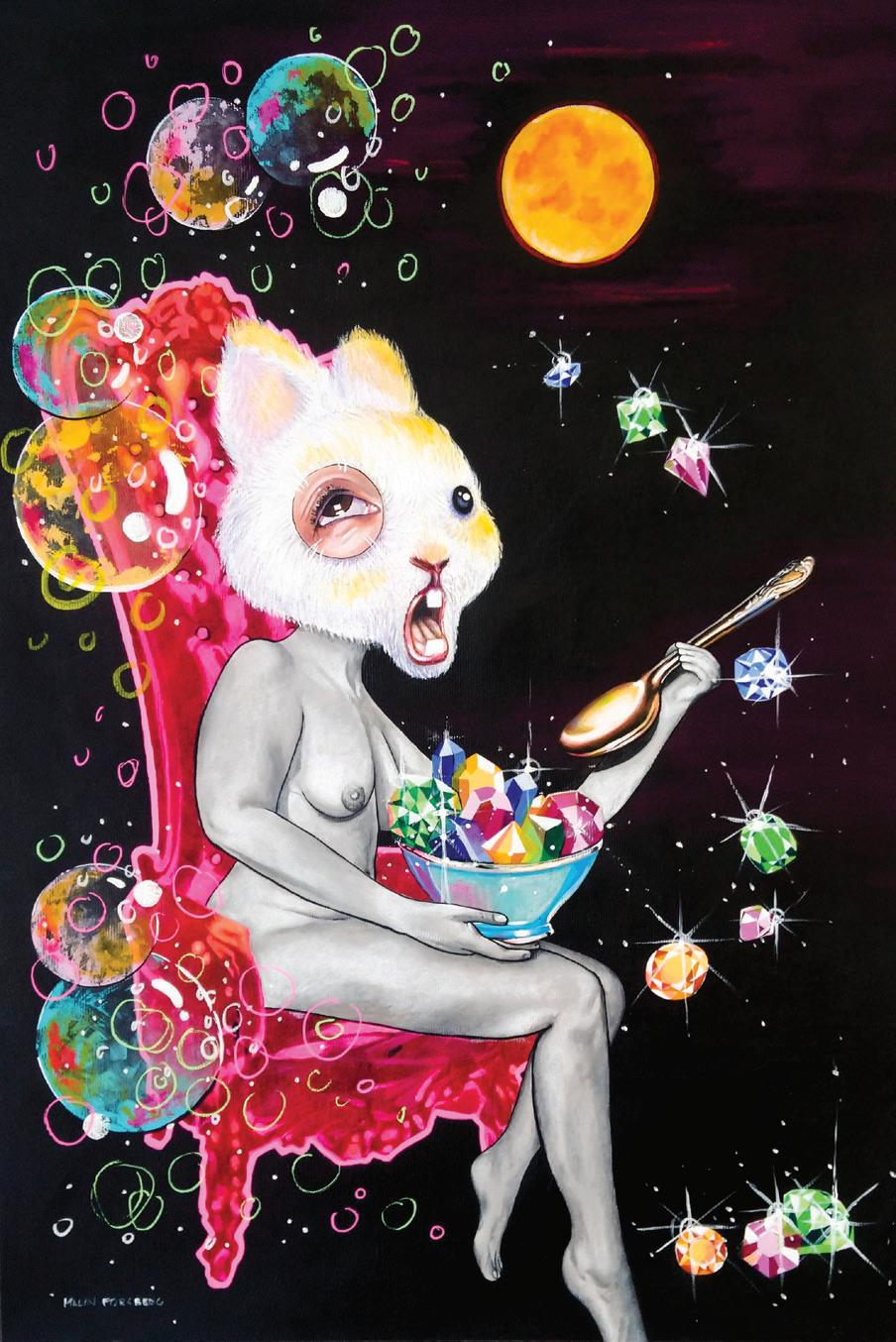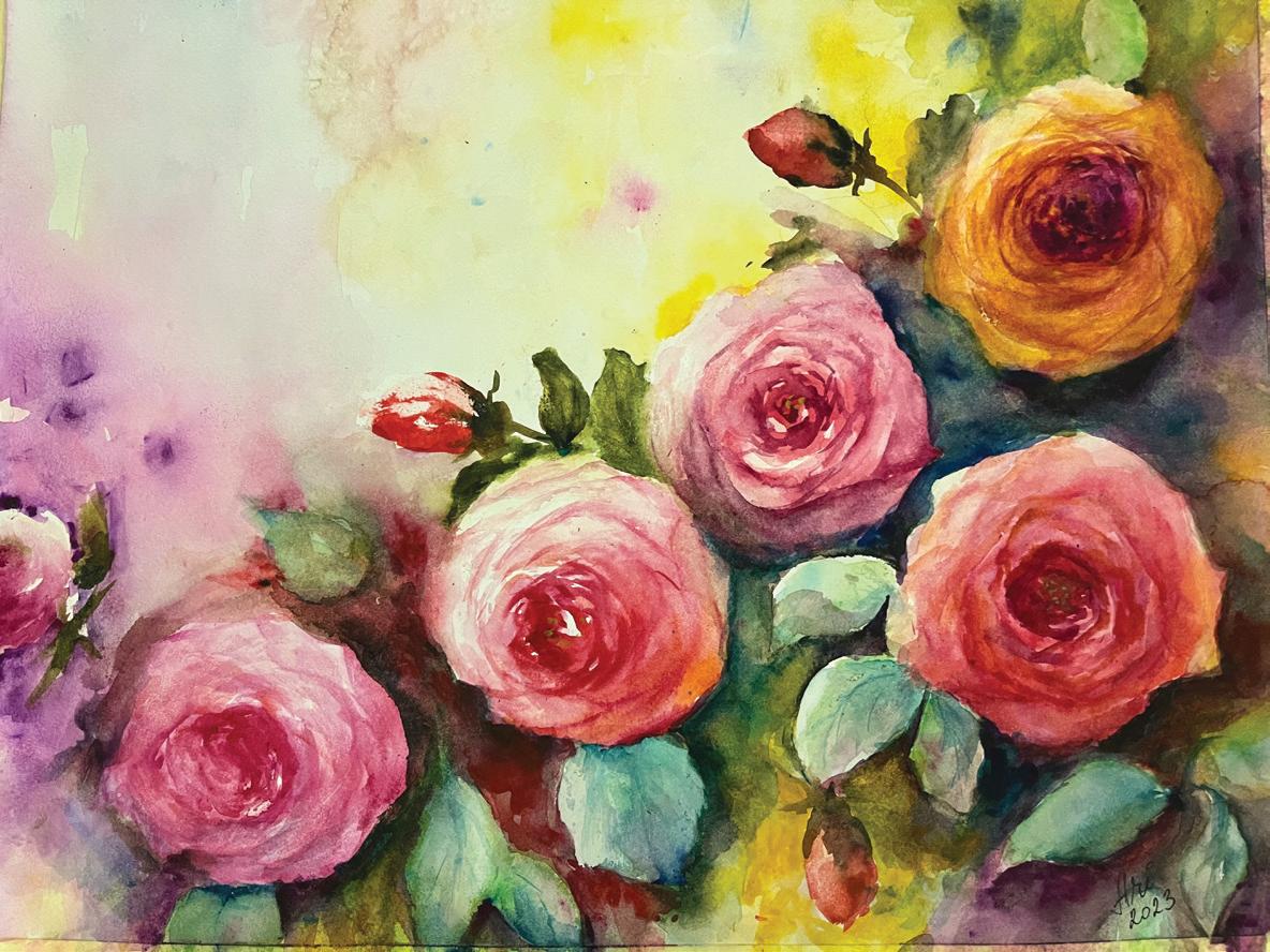 ranging from realistic to abstract, using pastels, acrylics, and watercolors. Aranka’s color palette is vibrant and feminine, with spots of color on the paper creating atmospheric vibrations