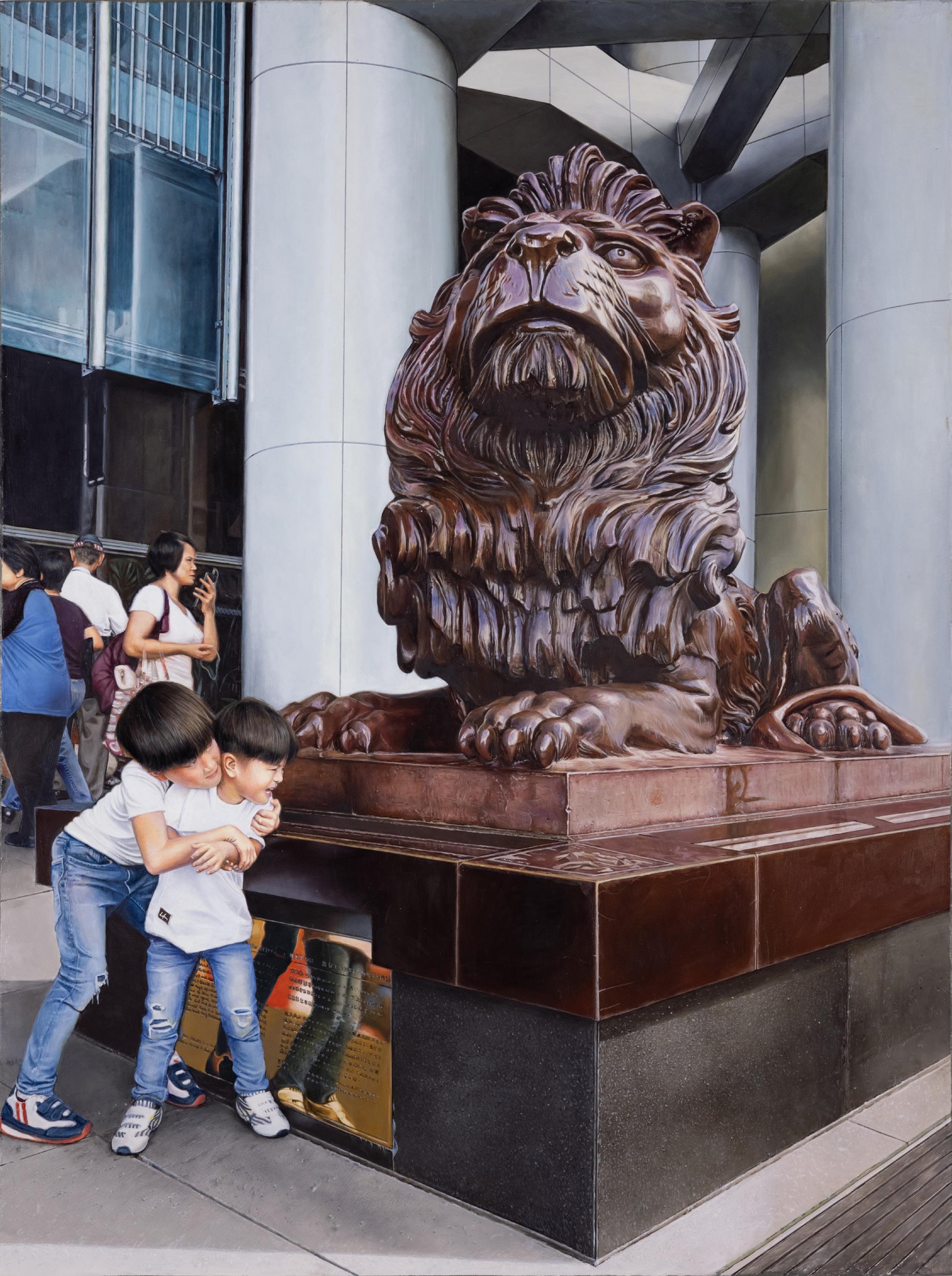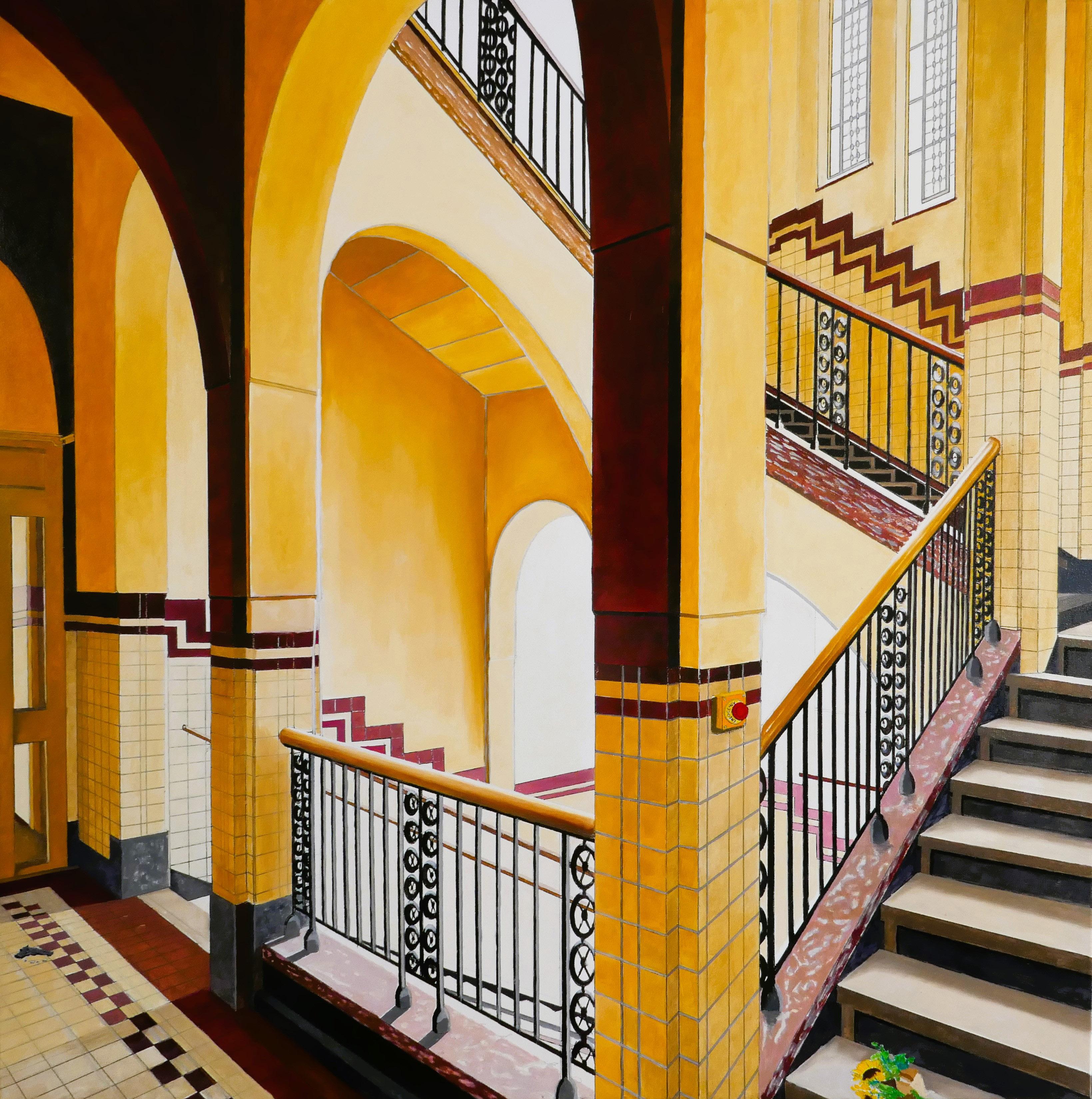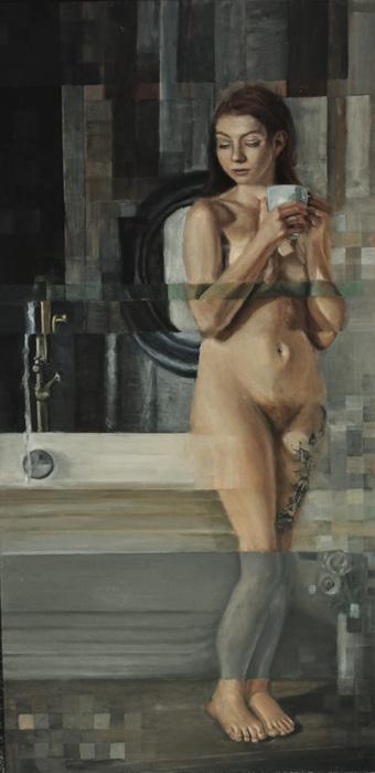 Webcams and surveillance technology can generate an array of social dilemmas. Such social challenges compel Arlene Buster to create her paintings. Arlene’s compositions portray scenes that draw the eye to the ever-present surveillance culture and the erosion of privacy. By utilizing oil paints, brushes, and canvases, she leads us into a world in which society is viewed through the lens of a camera. Arlene uses a realist approach to construct her works of figurative art. She deliberately implements pixelizations and glitches, known as technological nuisances, into her compositions.