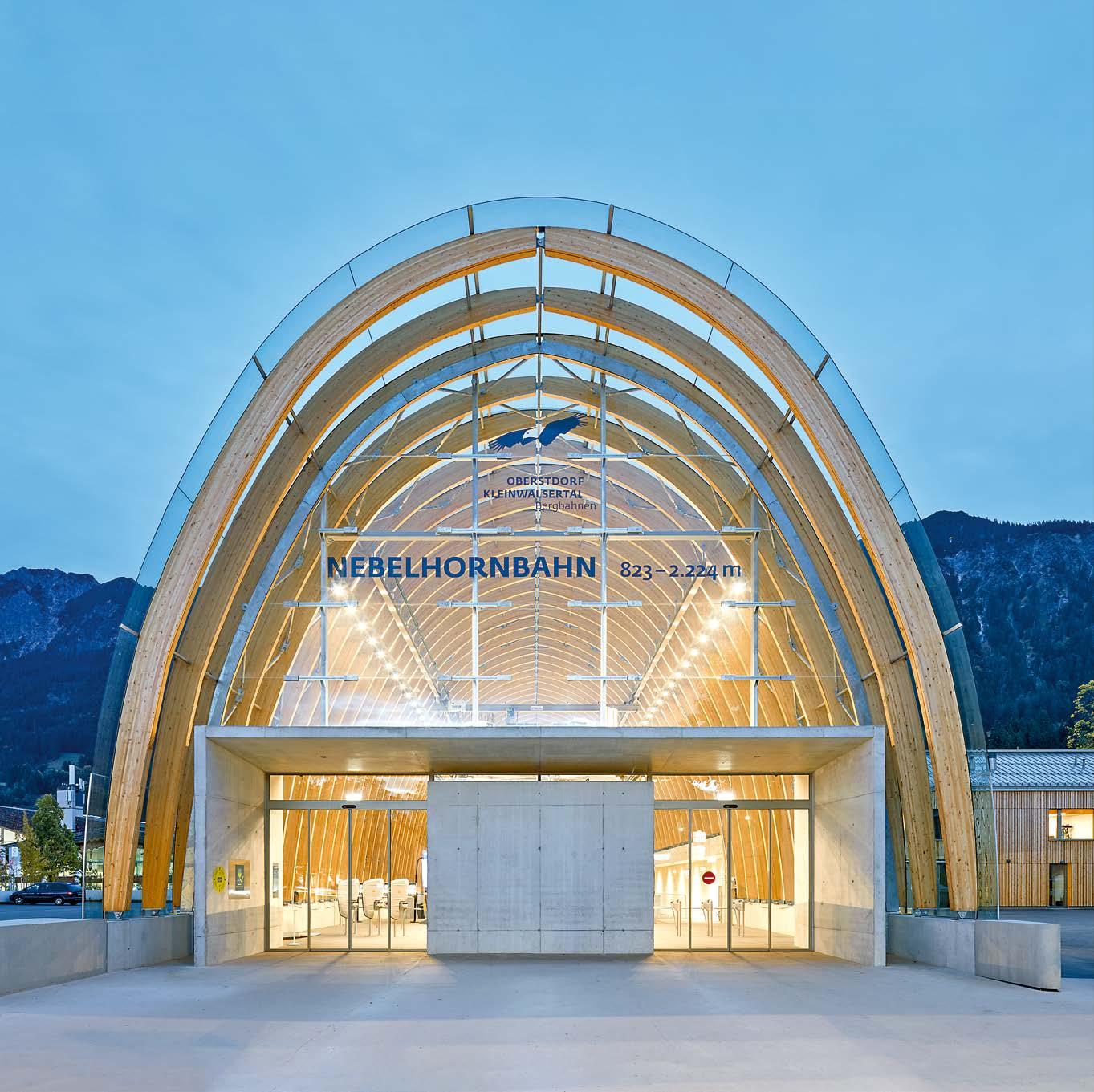 Für die Gebirgsgemeinde Oberstdorf ist die Bergbahn auf das Nebelhorn einer der wichtigsten touristischen Anziehungspunkte. Nach 90 Jahren Betriebszeit wurden die alten Großraumgondeln durch eine Zweiseil-Umlaufbahn mit Zehner-Gondeln ersetzt. 2016 stellten HK Architekten das neue Gipfelrestaurant fertig, nun die neue Talstation. Die einstige Gebäudemasse der Vorgängerbauten aus den Jahren 1930 und 1977 haben die Architekten in drei Häuser aufgeteilt, die einen attraktiven Dorfplatz sowie einen funktionalen Diensthof rahmen und den großen Touristenparkplatz von der Dorfstraße abschirmen.