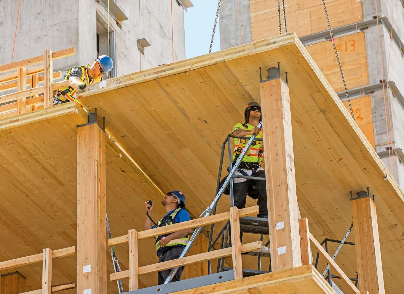 Der Schubverbund zwischen den einzelnen BSP-Platten erfolgt durch eine versenkte Dreischichtplatte, wodurch aus den Einzelplatten eine statisch nutzbare Scheibe entsteht. Alle horizontalen Kräfte (Wind und Erdbeben) werden über Stahlbänder aus dieser Scheibe in die betonierten Treppenhäuser übertragen. Bei hohen Gebäuden stellt die Lastweiterleitung von Stütze zu Stütze eine besondere Herausforderung dar, die hier über eigens entwickelte Stahlteile erfolgt, welche zugleich eine schnelle Montage ermöglichten. Das Gebäude konnte innerhalb kürzester Zeit errichtet werden: Pro Woche wuchs der Bau um zwei Geschosse.