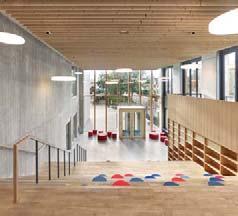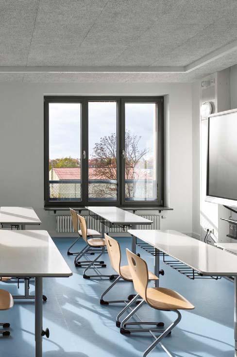 der Sporthalle. Ein neuer großzügiger Haupteingang verbindet Bestandsriegel und Anbau, dient als zentraler Treffpunkt und bietet Platz für Veranstaltungen. Im Zuge der Sanierung wurden die nicht tragenden Außenwände des Bestands rückgebaut. Lediglich die tragenden Stahlbetondecken und -wände blieben erhalten. Auf der Nordseite ergänzten die Architekten einen neuen, bis zu 3,90 m breiten kommunikativen Spielflur mit großzügigen Aufweitungen vor den Treppenhäusern. Dessen Stahlbetonkonstruktion schließt fugenlos an den Bestand an und dient als Längsaussteifung. Die Rohbaukonstruktion des Anbaus besteht ebenfalls aus massiven Decken, Wandpfeilern