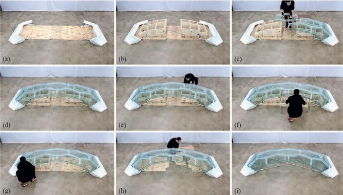 The final assembly sequence aims at limiting the number of lateral plate pairs that cannot have butterfly connections. Eventually, 20 out of the total 26 HGU-to-HGU contacts are secured by the butterfly locking mechanisms. Construction errors are almost inevitable at such scales, and it is impossible to know how errors will build up in advance. The distance between the two steel abutments can be adjusted by a turnbuckle to mitigate some errors in the glass bridge assembly. Also, the ductility of the Surlyn sheets absorbs a certain level of errors.