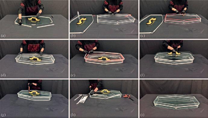Fig. 2.1.16: The assembly of a typical HGU: (a) the bottom deck plate and the bottom hoop of PLA jigs and HDPE bars; (b) all lateral plates are connected into a side-wall loop; (c) apply VHB tape to the bottom of the side-wall loop; (d) bond the side-wall loop to the bottom deck plate; (e) apply VHB tape to the top of the side-wall loop and place the top hoop of PLA jigs and HDPE bars; (f) place the top deck plate into the hoop; (g) strengthen the VHB bonding using a clamp; (h) remove all PLA jigs and HDPE bars; (i) a completed HGU.