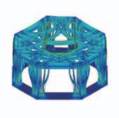 To design Diamanti, a comprehensive computational methodology was developed that includes the use of advanced form finding, optimization, and volumetric modeling approaches, all of which address common fabrication and construction constraints. At the start of the design process, PGS,26, 185 a geometry-based structural design method, was used to determine a structure capable of dealing with both compression and tension forces (Figure 3.1.4). Hence, a compression-tension combined funicular geometric model was developed.183 Polyhedral cells, defined by the resulting geometric model, were used to contort and align periodic anticlastic surfaces along the identified principal stress directions. Specifically, the diamond Triply Periodic Minimal Surface (TPMS) was selected to address embedment and fabrication constraints (Figure 3.1.5) and served as inspiration for the name “Diamanti.” Signed distance function modeling186, 187, 188 was used as a final step in the design workflow to combine the funicular form and embedded anticlastic surfaces into a smooth, unified model for fabrication. The diamond TPMS unit geometry enhances the geometric stiffness of the structural form and inherently provides the internal conduits for the post-tensioned cables, resulting in a fully integrated material-structural system. Figure 3.1.6 illustrates the entire computational method as a workflow. The resulting final detailed design, including internal force and form diagrams, post-tensioning, and other construction details, is displayed in Figure 3.1.7.