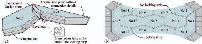one side of each sheet is glued to the corresponding HGU to fix its position using Gorilla™ transparent spray adhesive, which provides strong bonds without adding intolerable construction error. The choice of the assembly sequence of the HGU has a large impact on the number and locations of butterfly locking connections. It is also critical to note that the final keystone HGU may not have any butterfly locking mechanism on its lateral plates. Hence, it is more vulnerable to sliding and rotation. For this reason, a unit directly supported by the steel abutment with four sides is selected as the keystone (Figure 2.1.18b, unit No. 13).