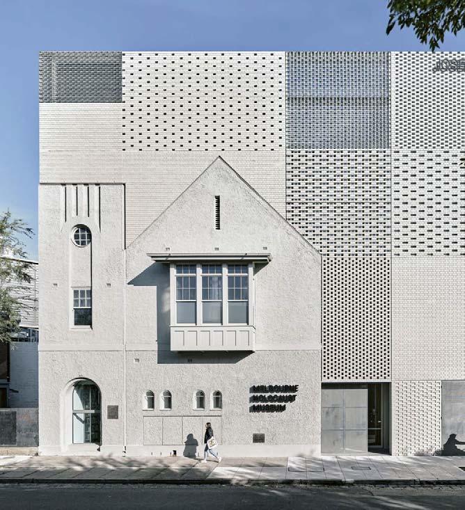 Welche Architektur ist adäquat für ein Gebäude, das an die Gräuel des Nationalsozialismus erinnert? Beim HolocaustMuseum in Elsternwick, einem Vorort von Melbourne, machten Kerstin Thompson Architects Licht zu ihrem zentralen Entwurfsmotiv: Licht als Sinnbild der Bildung und Aufklärung für einen Neubau, den jährlich Hunderte von Schulklassen besuchen. Von außen ist das erst auf den zweiten Blick zu erkennen: Ein historisches Erkerfenster und eine mit Glas verschlossene Bogentür an der Ecke sind die einzigen größeren Öffnungen in der Straßenfassade. Den Rest der Fläche bedeckt ein Patchwork aus grauen Ziegeln und Glasbausteinen in unterschiedlichen Mauerwerksverbänden. Die Kombination alter und neuer Bausubstanz verweist auf die Geschichte des Museums: 1984