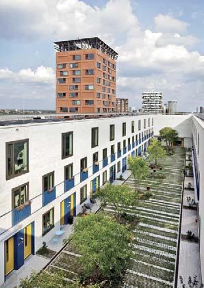 The central element is a flat, two storey building type with green interior courtyards. All parts of the building