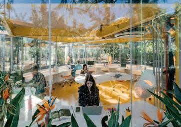 Eine unkonventionelle Arbeitsumgebung bietet der Co-Working Space Second Home in Los Angeles. An derDecke wirken Plastikschläuche als Schallabsorber und Verkleidung für die Verkabelungen. The Second Home co-working space inLos Angeles offers an unconventional working environment. Plastic tubes on theceiling act as sound absorbers andpanelling for the cabling.