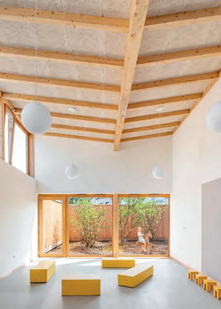 gebiet nahe Kopenhagen entstand eine Kindertagesstätte nach zirkulären Bauprinzipien. Die Materialien dafür kamen weitgehend aus einer baufälligen Grundschule, die zuvor auf der gleichen Liegenschaft stand. Lokale Bautraditionen und die nahe Natur dienten als Inspirationsquellen für neu gebaute Kitas in Hessen und Slowenien. Eine ehemalige Telefonzentrale aus DDR-Zeiten ist heute ein Raum zum Spielen und Toben und bildet das Herz einer Kindertagesstätte auf dem Gelände der Hochschule in Merseburg. So unterschiedlich diese ausgewählten Beispiele auch sein mögen, alle vereint eine gestalterische und konstruktive Prägnanz, die aus dem Dialog mit der Umgebung und seinen Geschichten resultiert. Vielleicht sind es gerade die Verbindungslinien, die jene spezielle Art von Geborgenheit schaffen, in der Kinder sich besonders frei entfalten können.