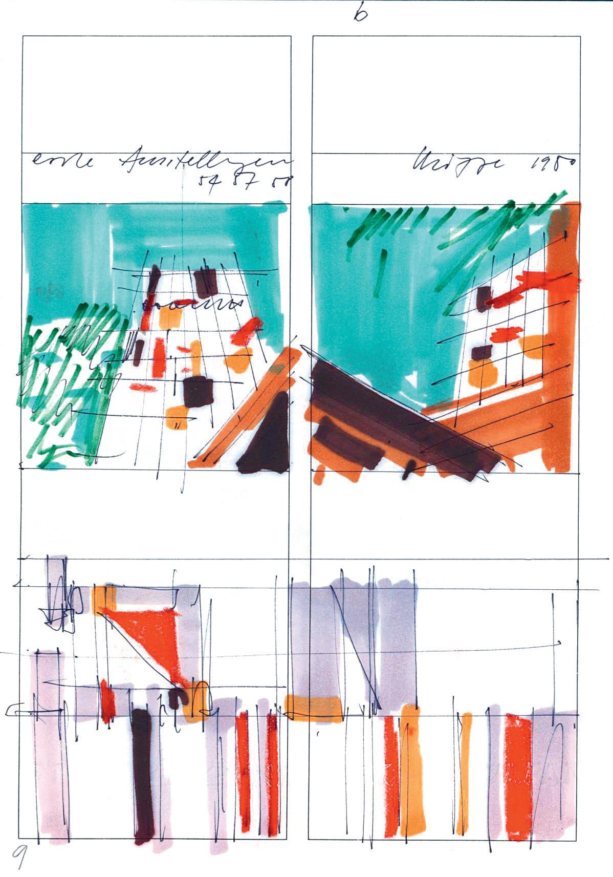 Besonders gut veranschaulichen diese Konzepte die Zeichnungen, die im Architekturmuseum der Technischen Universität München aufbewahrt werden, und die verwirklichten Projekte. Von den Fassaden bis zu den Glasfenstern, von den Innenräumen von Autos bis zu den Stoffen: Die Farbe stand immer im Mittelpunkt von Nestlers Kompositionen, unabhängig von der Art und Dimension des Projekts. Für diese Zeichnungen nutzte Nestler unterschiedliche Techniken; er bevorzugte Aquarellfarben, setzte aber auch Tusche, Pastellkreide, Filzstift oder Mischtechnik ein. Auch das Format variierte stark und reichte von großen, farbigen Tafeln bis zu kleinen Farbstudien [ Seite 207, 212 ]. 232 Einige der in diesem Buch analysierten Projekte illustrieren, was die Verwendung von Farbe angeht, Nestlers Methode der Farbkomposition beispielhaft, wie der Pavillon auf der Messe in Zagreb oder der Quiet Room im UN-Hauptquartier in New York, in dem der Raum mit der farblichen Orchestrierung der diagonalen Streifen und Materialien eine fast grafische Qualität erhielt.233
