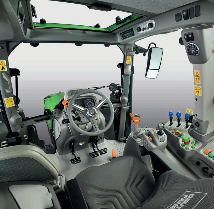La dernière génération de la cabine MaxiVision augmente ultérieurement sa fonctionnalité et offre à l'opérateur un confort exceptionnel, associé à une meilleure ergonomie et à une visibilité parfaite à 360°. Pour la première fois, DEUTZ-FAHR propose trois variantes afin de fournir exactement le niveau technologique correspondant aux besoins du client. MaxiVision est l'entrée de gamme et est disponible sur les modèles équipés de 2 ou 4 distributeurs mécaniques arrière. Elle propose toutes les caractéristiques que l'opérateur attend de DEUTZFAHR, avec un mélange de simplicité et de facilité d'utilisation. Toutes les commandes sont disposées de manière confortable et ergonomique et, comme le veut la tradition de DEUTZ-FAHR, elles adoptent un code de couleurs pour que même les nouveaux conducteurs s'y retrouvent rapidement. L'InfoCentrePro fournit à l'opérateur toutes les informations nécessaires et, pour l'utilisation d'un outil ISOBUS ou du guidage, l'iMonitor de 8 pouces est également disponible. Les options de sièges pivotant jusqu'à 30 degrés, le système de climatisation remanié avec ses sorties d'air supplémentaires, le concept de suspension sophistiqué, les matériaux de haute qualité et sa taille font de la cabine MaxiVision le lieu idéal où se trouver, même lors d'une longue journée de travail.