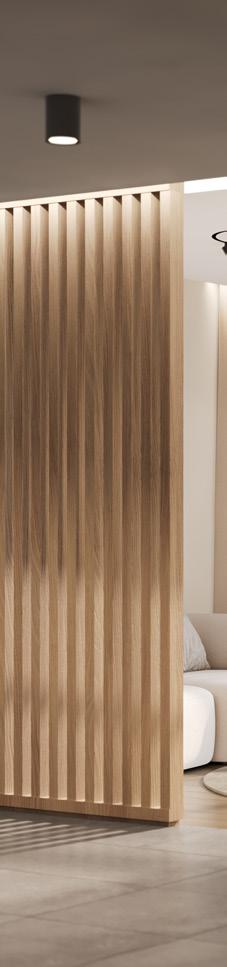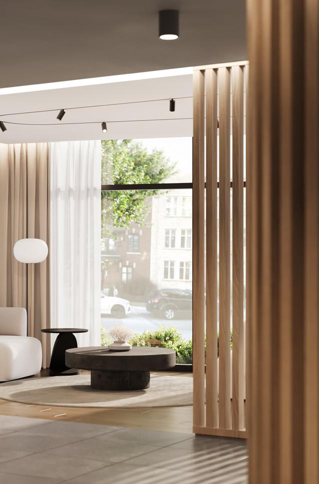 • Au rez-de-chaussée, vous serez accueilli par un hall d’entrée qui donne le ton à tout le projet, avec son ambiance feutrée et chaleureuse ainsi que ses lattes de bois apportant un luxe décontracté. Ici, place à la présence dominante du bois qui illumine l’espace. • On the first floor, the entrance hall sets the tone for the entire project with a warm, cozy atmosphere and the casual luxury of the wooden slats. Revel in the dominating wood illuminating the space.