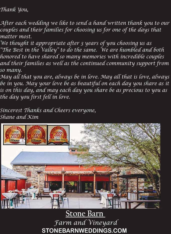 for more information: www.stonebarnweddings.com or 570-336-7085.