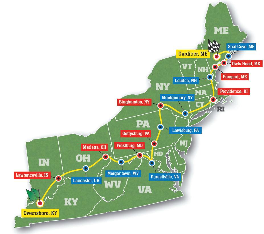 This year’s race begins June 22 in Owensboro, Kentucky. From there, competitors will set out to be the first to arrive in Gardiner, Maine on June 30.