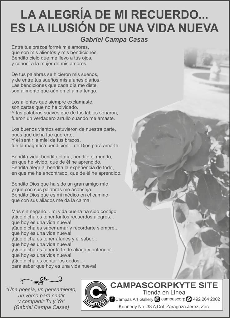 Fuente: BANORTE www.dialogojerez.com @dialogojerez dialogojerez@gmail.com 22 DE ENERO DE 2023 12 22°C MAX 2°C MIN Compra $17.75 Venta $19.15 NÚMERO 2295 ENFERMEDADES Y CIRUGÍAS DE LOS OJOS LENTES URGENTES EN UNA HORA LENTES POLARIZADOS DESDE $200.00 LENTES MONOFOCALES DESDE $500.00 Todos los lentes solares 10% de descuento Cofepris 464111 Jerez de García Salinas, Zacatecas www.cielovistaojos.com Manejamos marcas como: Gucci, Ray Ban, Nivada, Carolina Herrera, VersaceMichael Kors, Prada, Tiffany, Dolce Gabanna, Vogue, Adidas, Puma, Ralph Laurent y Polo. Calle del Santuario No. 23-Bis C.P. 99300 Tel. 494 945 3302 vitolassmalo@hotmail.com C. Tulipanes No. 39 esq. Paseo Fuensanta Fracc. Jardines de López Velarde Tel. 494 945 5221 y 494 945 8000 EN