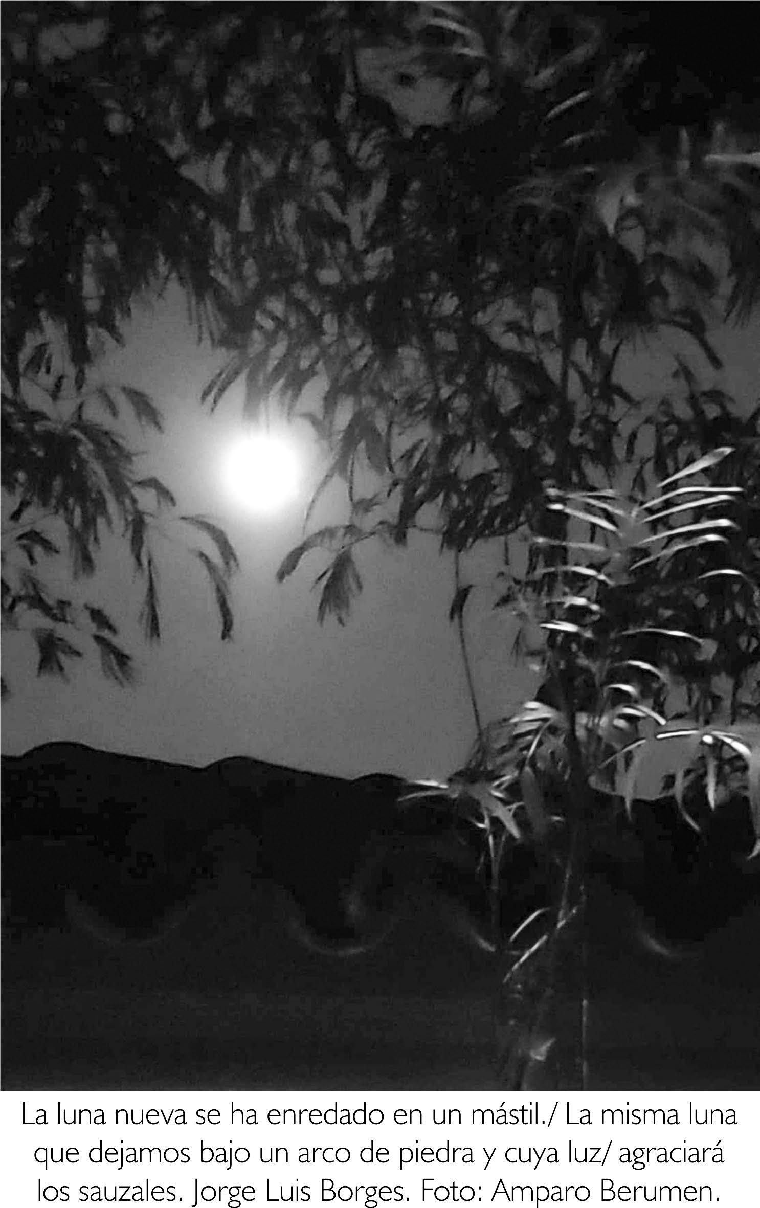 Claras como una feria brillan las nubes –dice Borges La luna nueva se ha enredado en un mástil./ La misma luna que dejamos bajo un arco de piedra y cuya luz/ agraciará los sauzales.