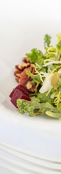 Sauté the pumpkin seeds in a pan on high heat with oil until golden in color and set aside. After the beets have cooled cut into 1/2-inch cubes and set aside. Combine all ingredients in bowl and dress when ready to serve.