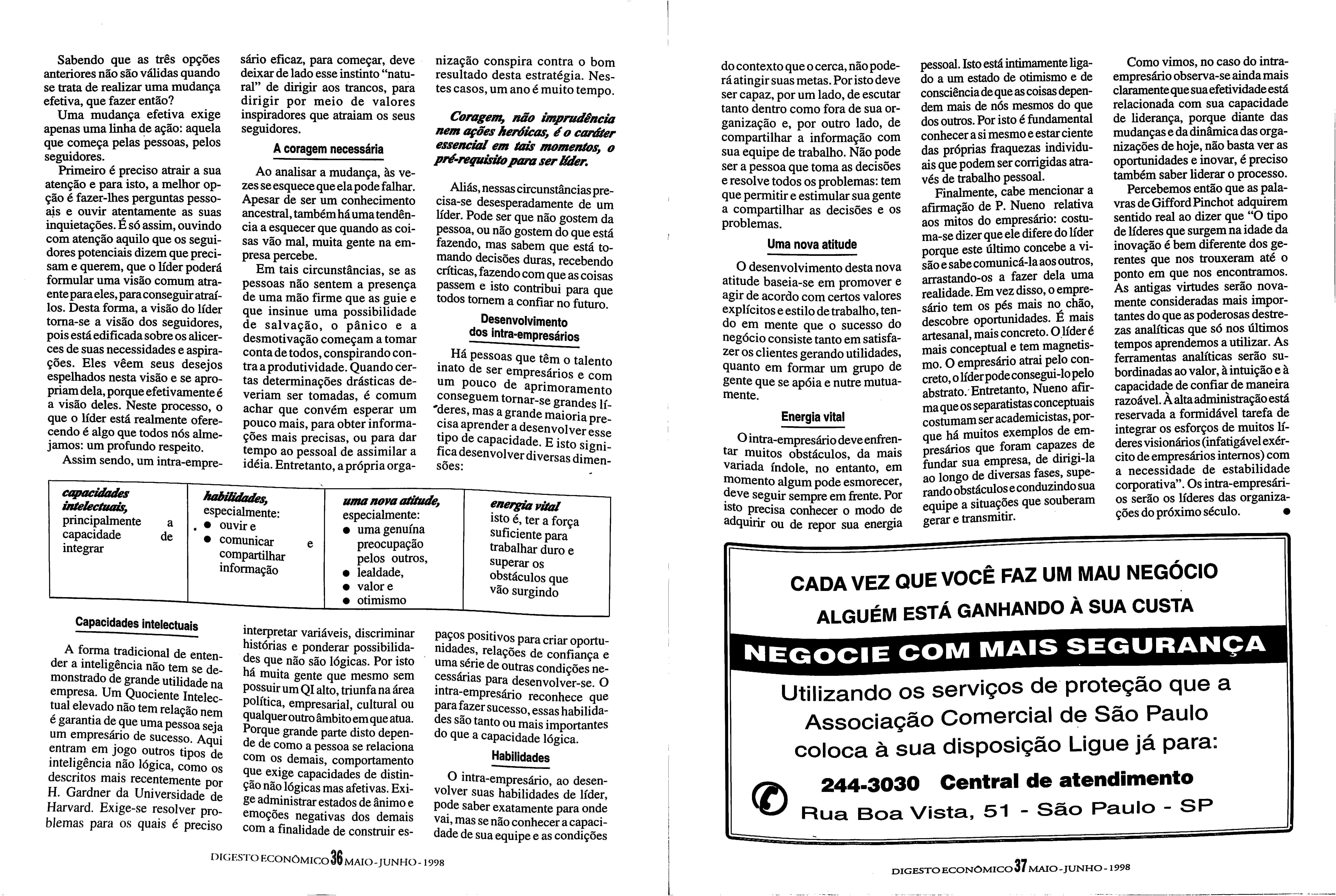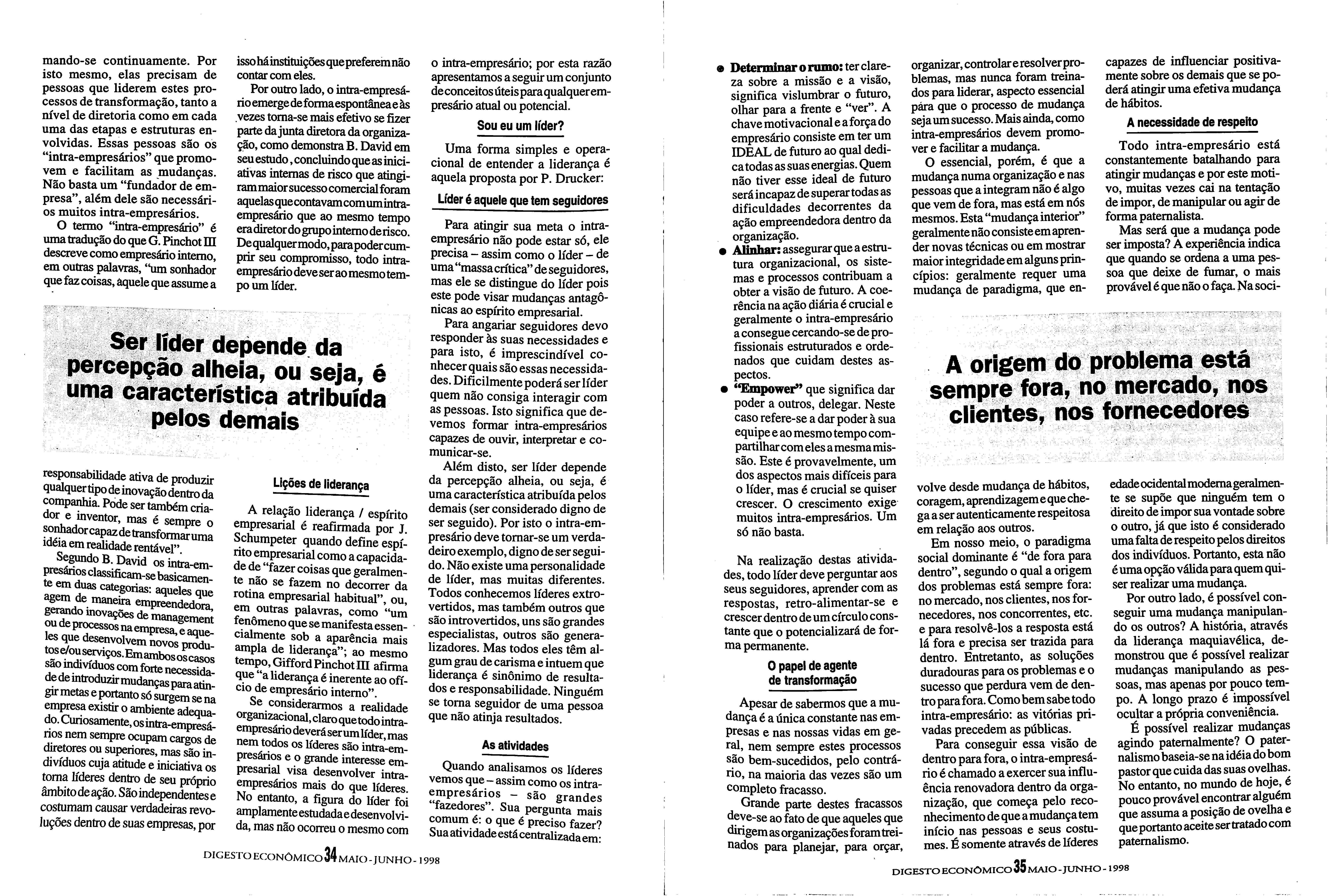 Percebemos então que as pala vras de Gifford Pinchot adquirem sentido real ao dizer que “O tipo de líderes que surgem na idade da inovação é bem diferente dos ge rentes que nos trouxeram até o ponto em que nos encontramos. As antigas virtudes serão nova mente consideradas mais impor tantes do que as poderosas destrezas anaKticas que só nos últimos tempos aprendemos a utilizar. As ferramentas analíticas serão su bordinadas ao valor, à intuição e à capacidade de confiar de maneira razoável. À alta administração está reservada a formidável tarefa de integrar os esforços de muitos lí deres visionários (infatigável exér cito de empresários internos) com a necessidade de estabilidade corporativa”. Os intra-empresários serão os líderes das organiza ções do próximo século. ●