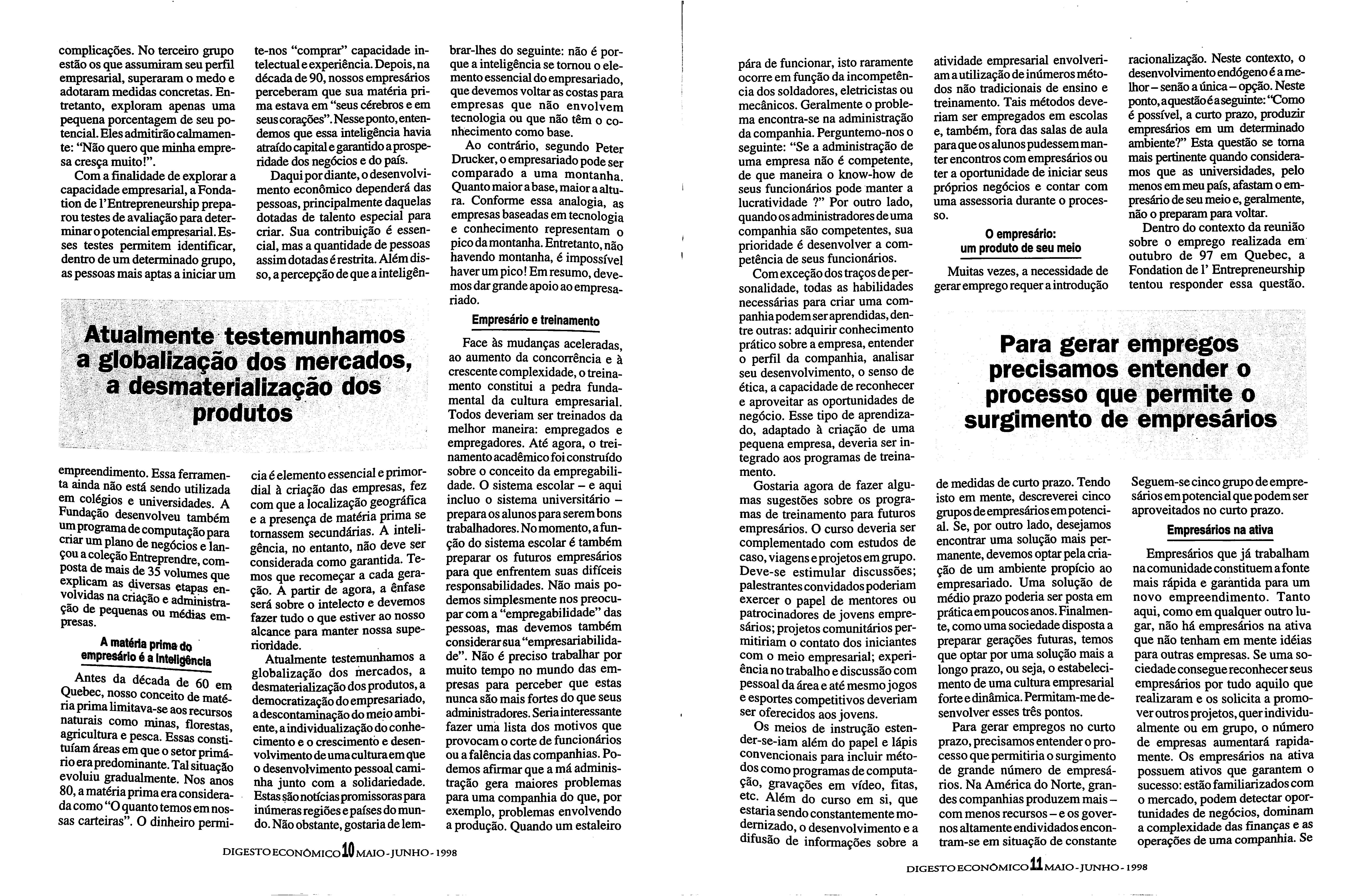 Face às mudanças aceleradas, ao aumento da concorrência e à crescente complexidade, o treina mento constitui a pedra funda mental da cultura empresarial. Todos deveríam ser treinados da melhor maneira: empregados e empregadores. Até agora, o trei namento acadêmico foi construído sobre o conceito da empregabilidade. O sistema escolar - e aqui incluo o sistema universitárioprepara os alunos para serem bons trabalhadores. No momento, a fun ção do sistema escolar é também preparar os futuros empresários para que enfrentem suas difíceis responsabilidades. Não mais po demos simplesmente nos preocu par com a “empregabilidade” das pessoas, mas devemos também considerar sua “empresariabilidade”. Não é preciso trabalhar por muito tempo no mundo das em presas para perceber que estas nunca são mais fortes do que seus administradores. Seria interessante fazer uma lista dos motivos que provocam o corte de funcionários ou a falência das companhias. Po demos afirmar que a má adminis tração gera maiores problemas para uma companhia do que, por exemplo, problemas envolvendo a produção. Quando um estaleiro empreendimento. Essa ferramen ta ainda não está sendo utilizada em colégios e universidades. A Fundação desenvolveu também um programa de computação para cnar um plano de negócios e \m- çou a coleção Entreprendre posta de mais de 35 volumes exphcam as ^versas etapas en volvidas na criàção e adnünistra- çao de pequenas ou médias em presas.