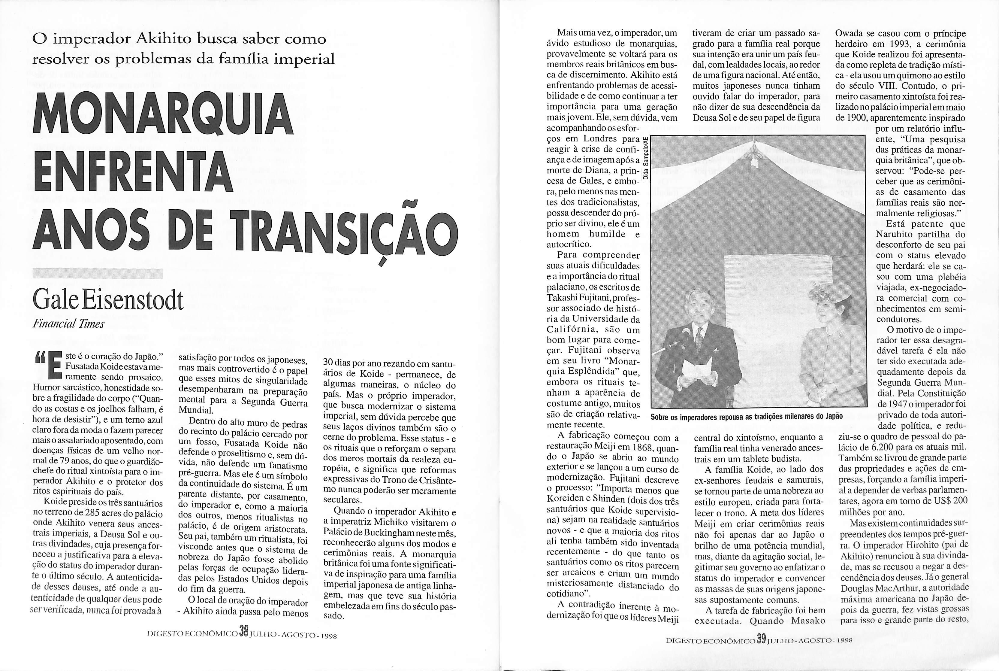 A reforma constitucional limitou-se à ordem econômica, à orga nização do Estado e à Previdên cia. Os passos empreendidos fo ram importantes mas insatis fatórios. Houve timidez na elimi nação dos instrumentos legais que sustentam o Estado-empresário. Os arranjos para assegurai* a so brevivência da Petrobrás ainda vão nos custar | \ ^ muito caro. Ao invés de J \ óleo, temos monopólio, S como disse muito bem o % \ responsável pela Agen- | cia que tem o poder de o controlaraempresa.Du- .S vido que haja alguém nesse país que acredite na efetivação dessa proeza. O governo, por sua vez, faz o que pode paraevitai*aprivatização da infra-estrutura. Em bora 0 monopólio do serviço telefônico haja sido eliminado no pri meiro semestre do novo mandato, está prestes a expirar sem que nada ti vesse acontecido (as em presas que aceitaram vender celulares man tida em mãos do Estado a infra-estrutura que o peiTnite devem ter caído n \ eliminação do Ministé rio da Saúde, já que o exercício de funções meramente financeiras poderia ficar diretamen te na área econômica. Quando muito, poderia haver uma Coordena ção de Campanhas (pa ra iniciativas do tipo vacinação em massa) ou situações emergenciais (ameaça de epidemia, etc.) Na mesma linha de enxugamento da má quina federal, dever-seia igualmente progra mar a sucessiva extindo Ministério da