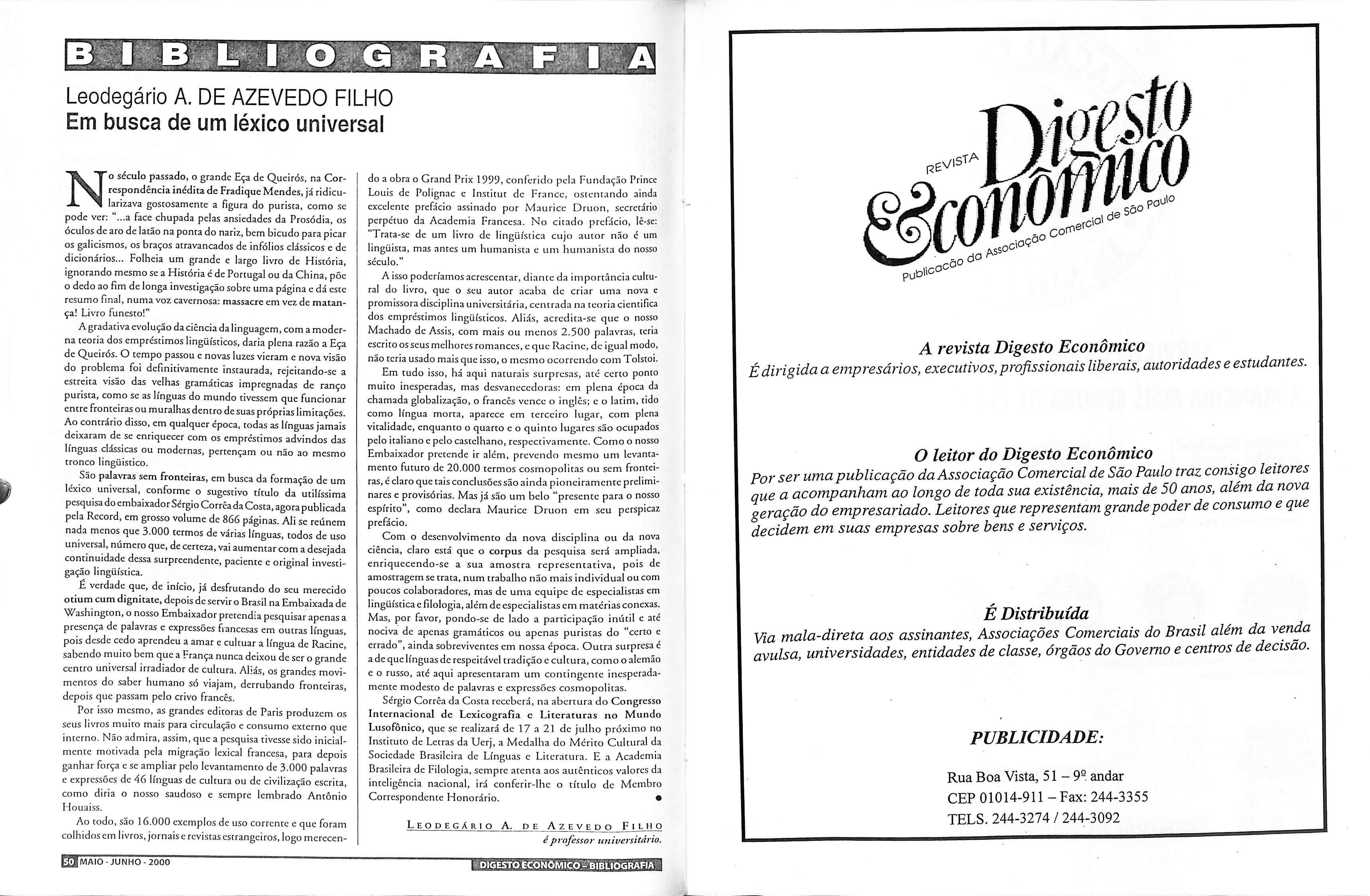A isso poderiamos acrescentar, diante da importância cultu ral do livro, que o seu autor acaba de criar uma nova e promissora disciplina universitária, centrada na teoria cientifica dos empréstimos lingüísticos. Aliás, acredita-se que o nosso Machado dc A.ssis, com mais ou menos 2.500 palavras, leria escrito os seus melhores romances, e que Racine, dc igual modo, não teria usado mais que isso, o mesmo ocorrendo com Tolstoi. Em tudo isso, há aqui naturais surpresas, até certo ponto muito inesperadas, mas dcsvaneccdoras: cm plena época da chamada globalização, o francês vence o inglês; c o latim, tido como língua morta, aparece cm terceiro lugar, com plena vitalidade, enquanto o quarto c o quinto lugares são ocupados pelo italiano c pelo castelhano, respectivainente. Como o nosso Embaixador pretende ir além, prevendo mesmo um levanta mento futuro dc 20.000 termos cosmopolitas ou sem frontei ras, é claro que tais conclusõessão ainda pionciramente prelimi nares e provisórias. Mas já são um belo “presente para o nosso espírito’, como declara Mauricc Druon em seu perspicaz prefácio.