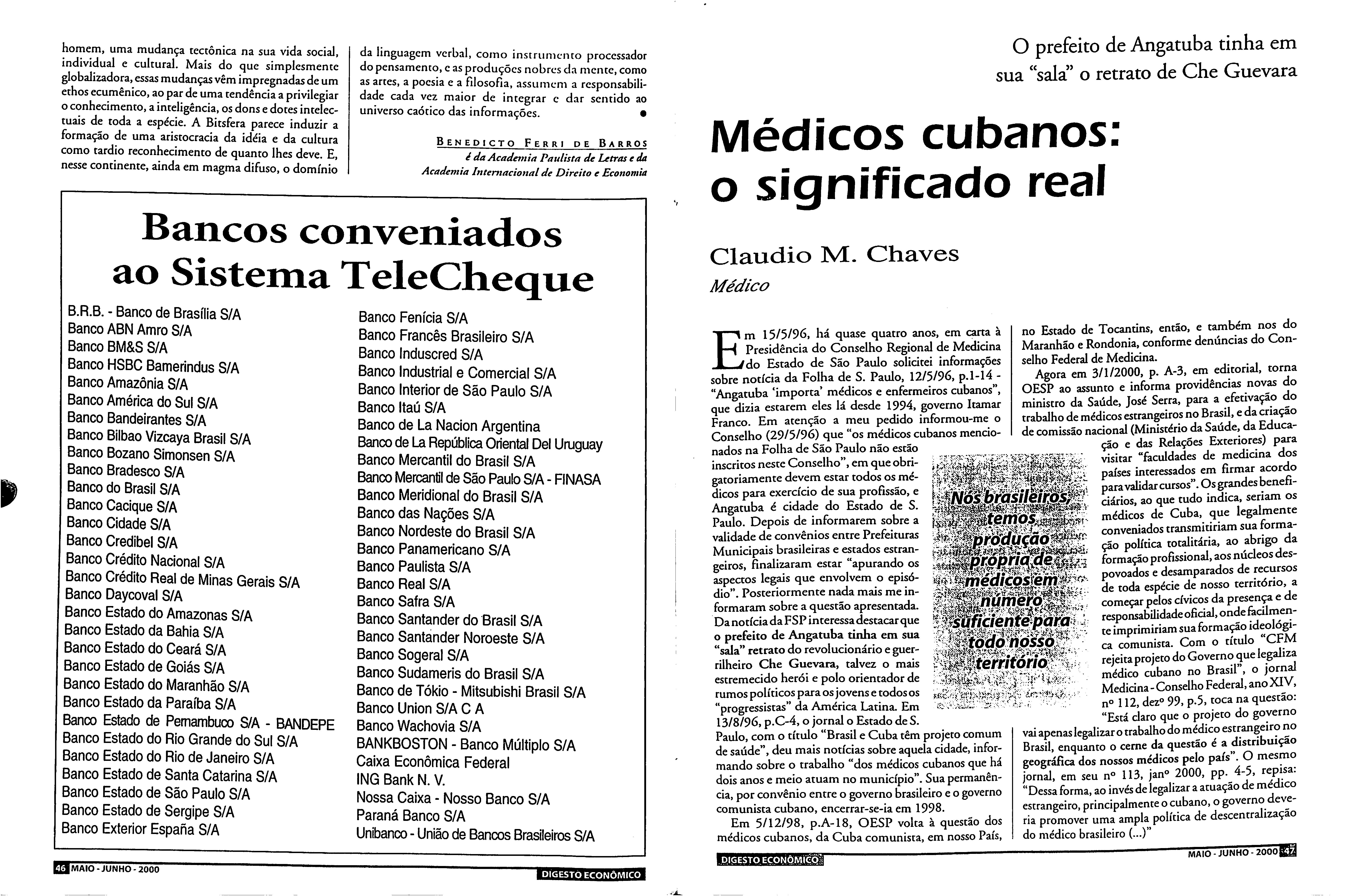 Cubaoiicialmcmc comunista? boi ingeiuiidadj o secretá rio do Conselho Federal dc Medicina (jan^’ 2(100) aventar possibilidade ser “solidariedade” o móvel da vinda dos médicos cubanos ao Brasil. Ingenuidade, ignorância dos reais objetivos do.s acordos, ou faíseamento dc neces sidades nossas para atender aos interesses Cuba c de quem oficialmenrc aqui comunga e ajusta - que foi que levou o cdltorialista d O Estado de S.Paulo (3/1/2000) a escrever?: “Seja qual fora nenhuma comunidade pode como cao no qual era, até a posse atual, primeiros de no Brasil com eles