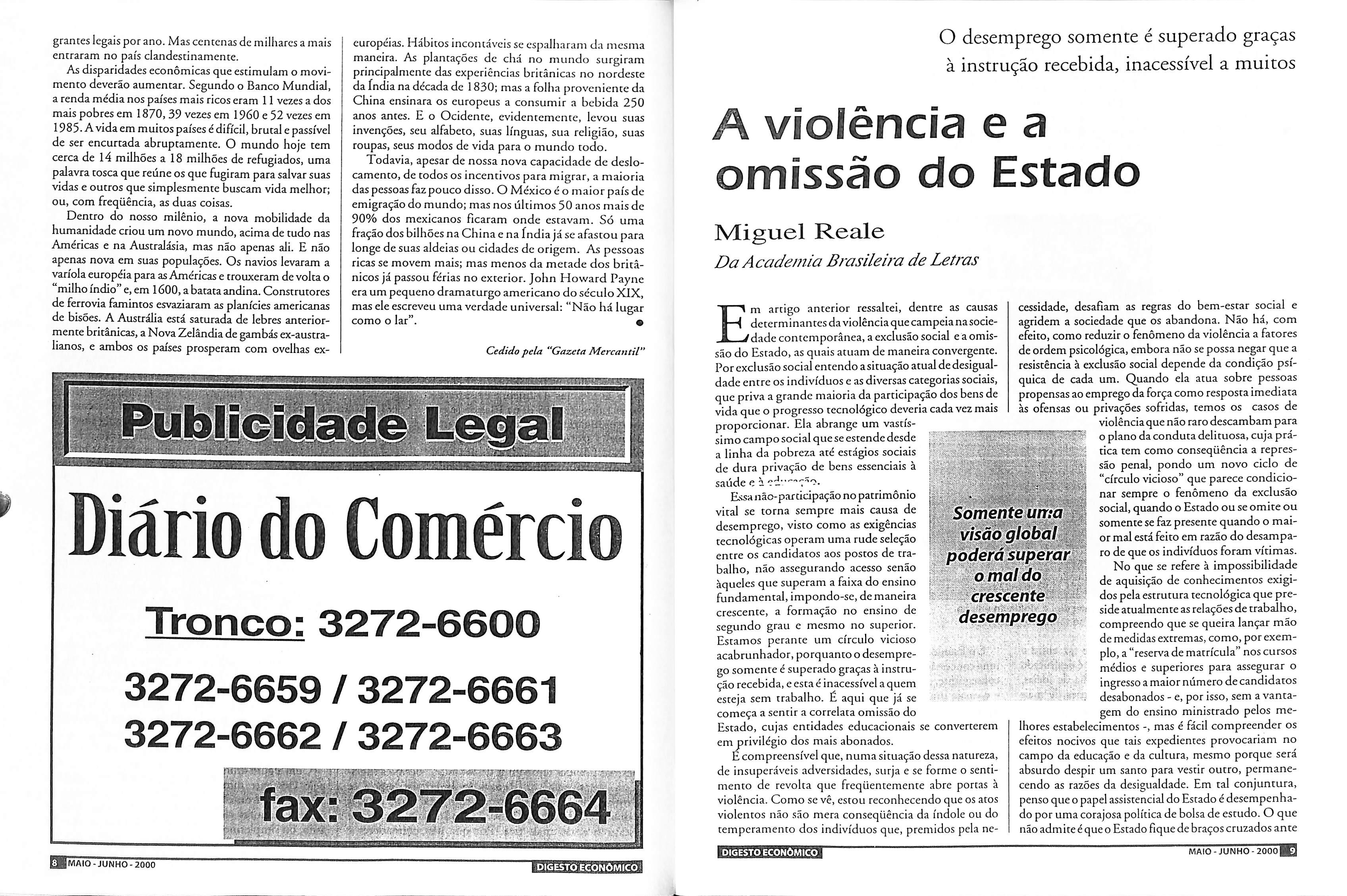 Passando a outro as pecto da questão, parece-me necessário salien tar que uma das causas da violência é o desolado confronto que se faz entre o scatus social de que se dispõe e aquele que é desfrutado por uma afortunada minoria. Nessa linha de idéias, cabe dizer que no Brasil - uma das nações de mais desigualdade na distribuição da riqueza - detentores do maior poder econômico primam pela ostentação, sendo o desejo de aparecer tão forte como o de dominar, tornando mais gritante o contraste e o confronto com os que o saudoso amigo Cesarino J únior denominava hipossuficientes. Objetar-se-á que esse é um fenômeno universal e que a chamada “era da informação , com a vertiginosa aceleração dos meios de comunicação, cria, dia a dia, novos motivos de atração, IHmAIO-JUNHO-2000 “ "