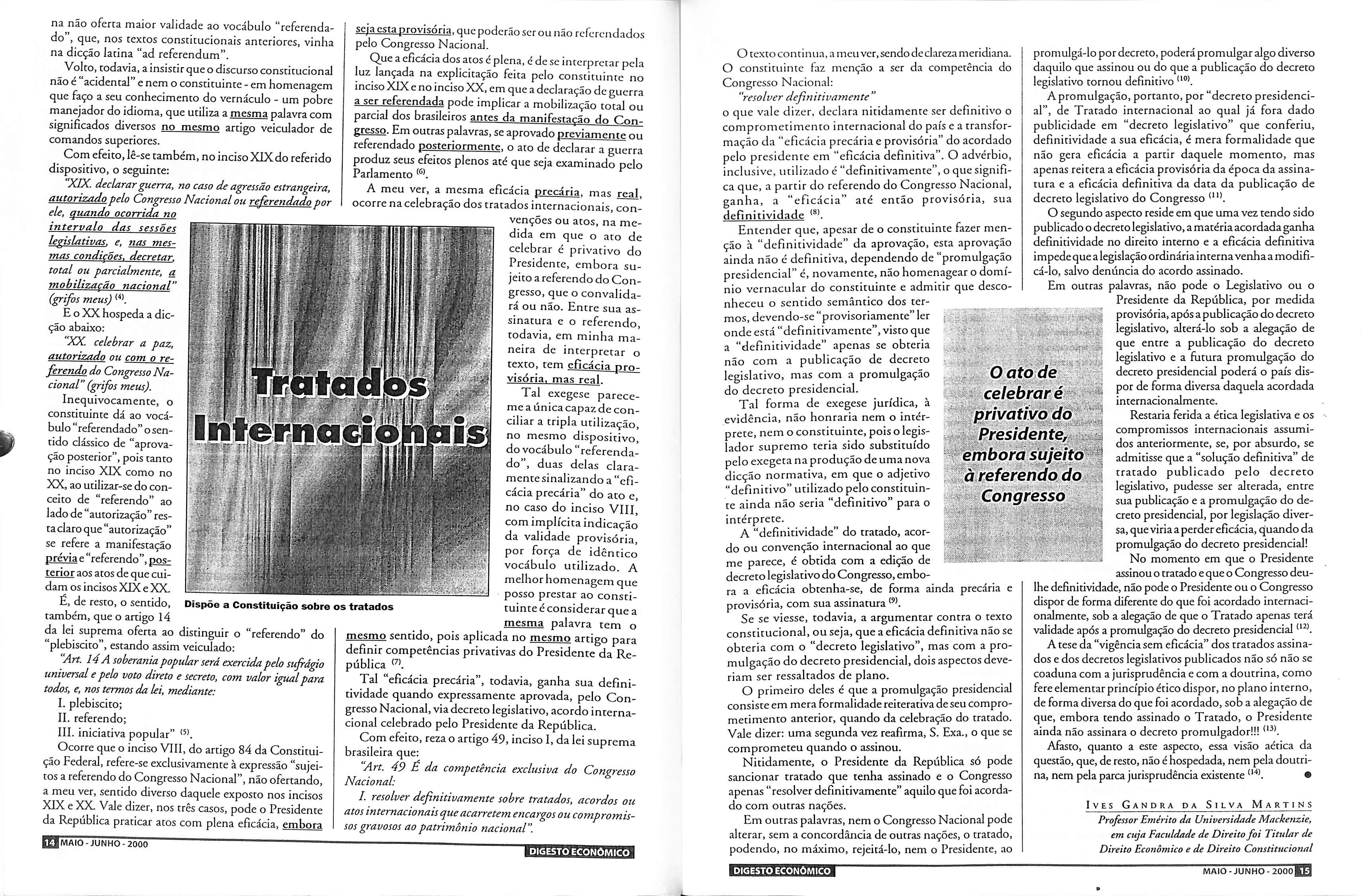 (1) Manoel Gonçalves Ferreira Filho ensina: “Diferentemente, a Cons tituição de 1946 (art. 87. VII) apenas submetia à aprovação do Congresso Nacional os tratados e convenções internacionais. Ora, a expressão atos internacionais abrange muito mais do que tratados e convenções. É um gênero onde aparecem os tratados e as convenções inseridos como espécie.