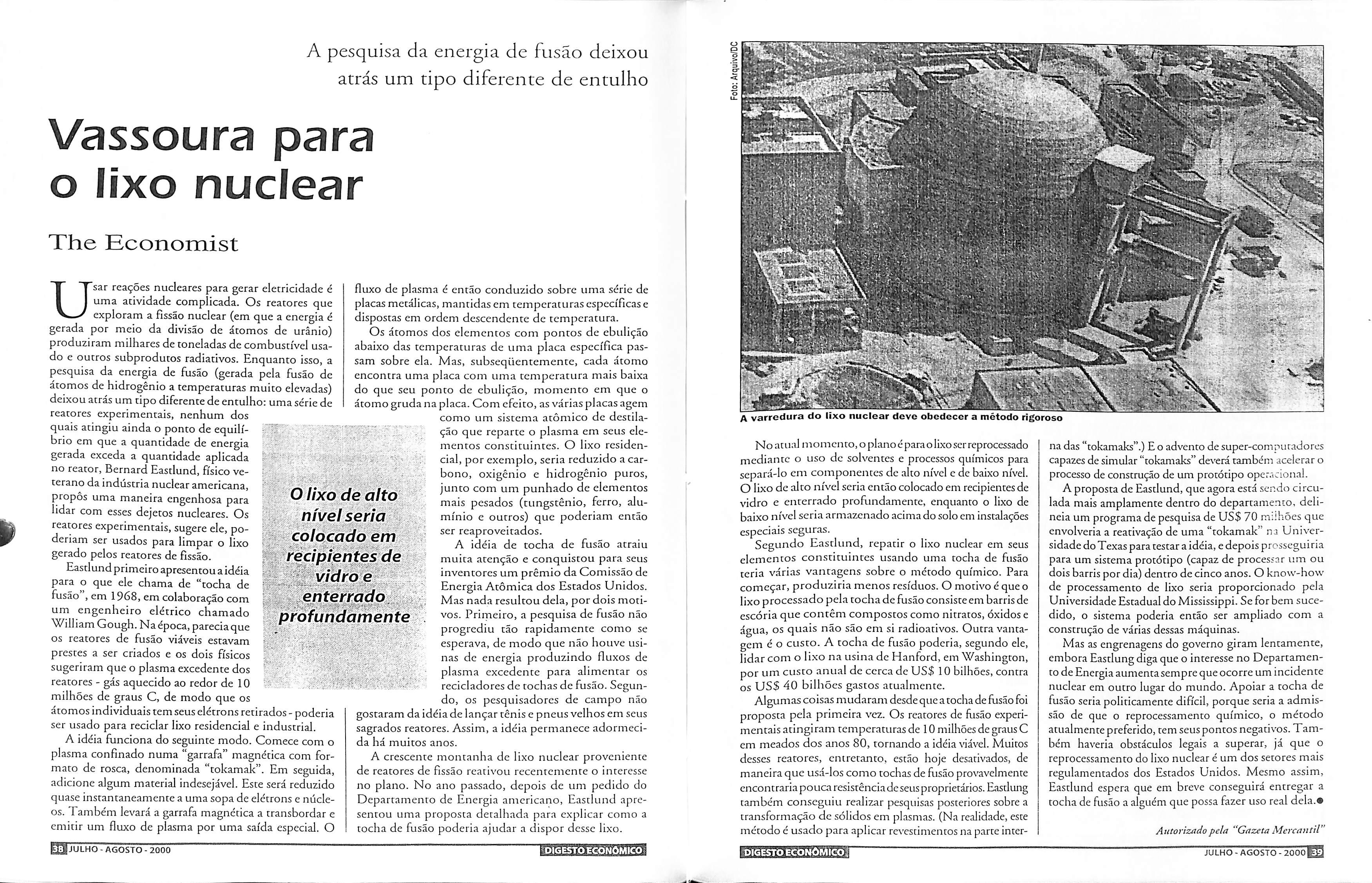 tipo diferente de entulho: uma série de reatores experimentais, nenhum dos quais atingiu ainda o ponto de equilí- - - brio em que a quantidade de energia gerada exceda a quantidade aplicada no reator, Bernard Eastlund, físico terano da indústria nuclear veamericana, propôs uma maneira engenhosa para lidar com esses dejetos nucleares. Os reatores experimentais, sugere ele, po deriam ser usados para limpar o lixo gerado pelos reatores de fissão.